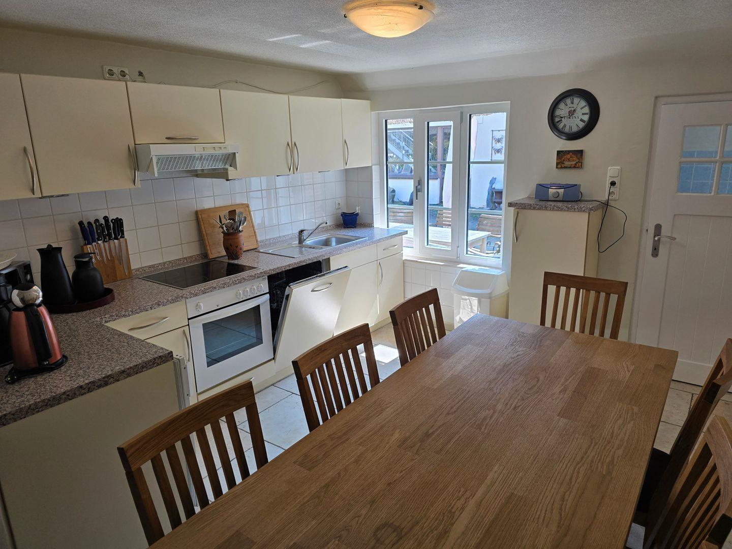 Die vollausgestatte Einbauküche ist umfassend mit Geschirrspüler, 4er-Ceranfeld, Backofen, Kühlschrank, Gefrierfach und diversen Küchengeräten für die komplette Selbstversorgung ausgestattet. An dem großen Esstisch finden alle ein Plätzchen, um gemeinsam zu speisen oder zusammen den nächsten Urlaubstag zu planen.