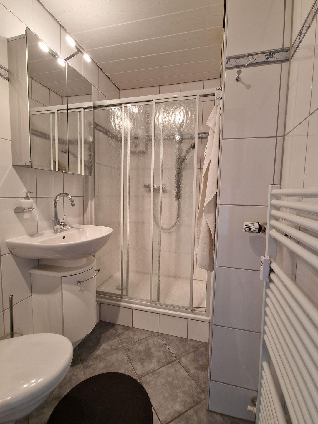 Das innenliegende Duschbad verfügt über einen Handtuchheizkörper, WC, Dusche mit Schiebetüren, einen großen beleuchteten Spiegelschrank und Verstau- und Ablageflächen.