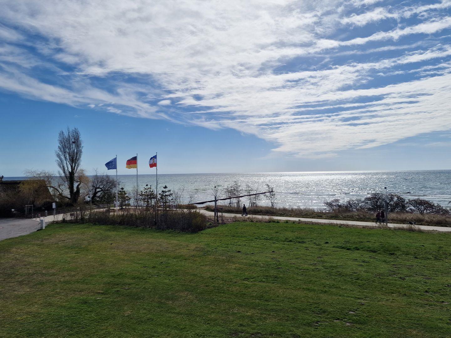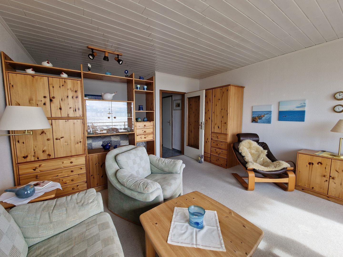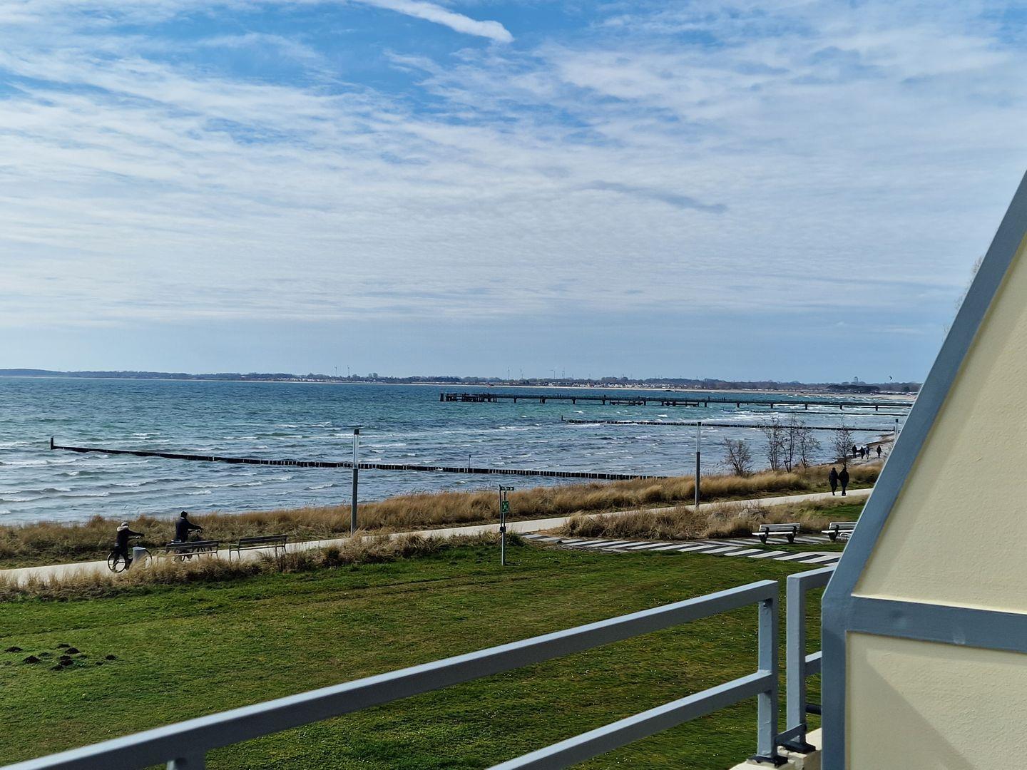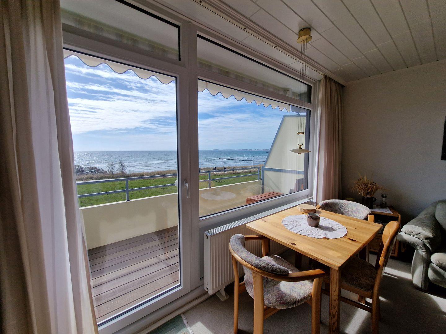 Durch die besondere Lage verfügt die helle Wohnung im 2. Stock über eine große Fensterfront in südlicher Ausrichtung. In erster Baureihe am Strand haben Sie von hier einen unverbauten, fantastischen Meerblick und zu jeder Tageszeit die Möglichkeit ein sonniges und geschütztes Plätzchen zum Entspannen zu finden. Der Balkon ist umfassend möbliert: Hochlehner mit Auflagen und ein großer Tisch unter der Markise laden Sie ein, Ihren Aufenthalt bei schönstem Wetter draußen zu genießen.