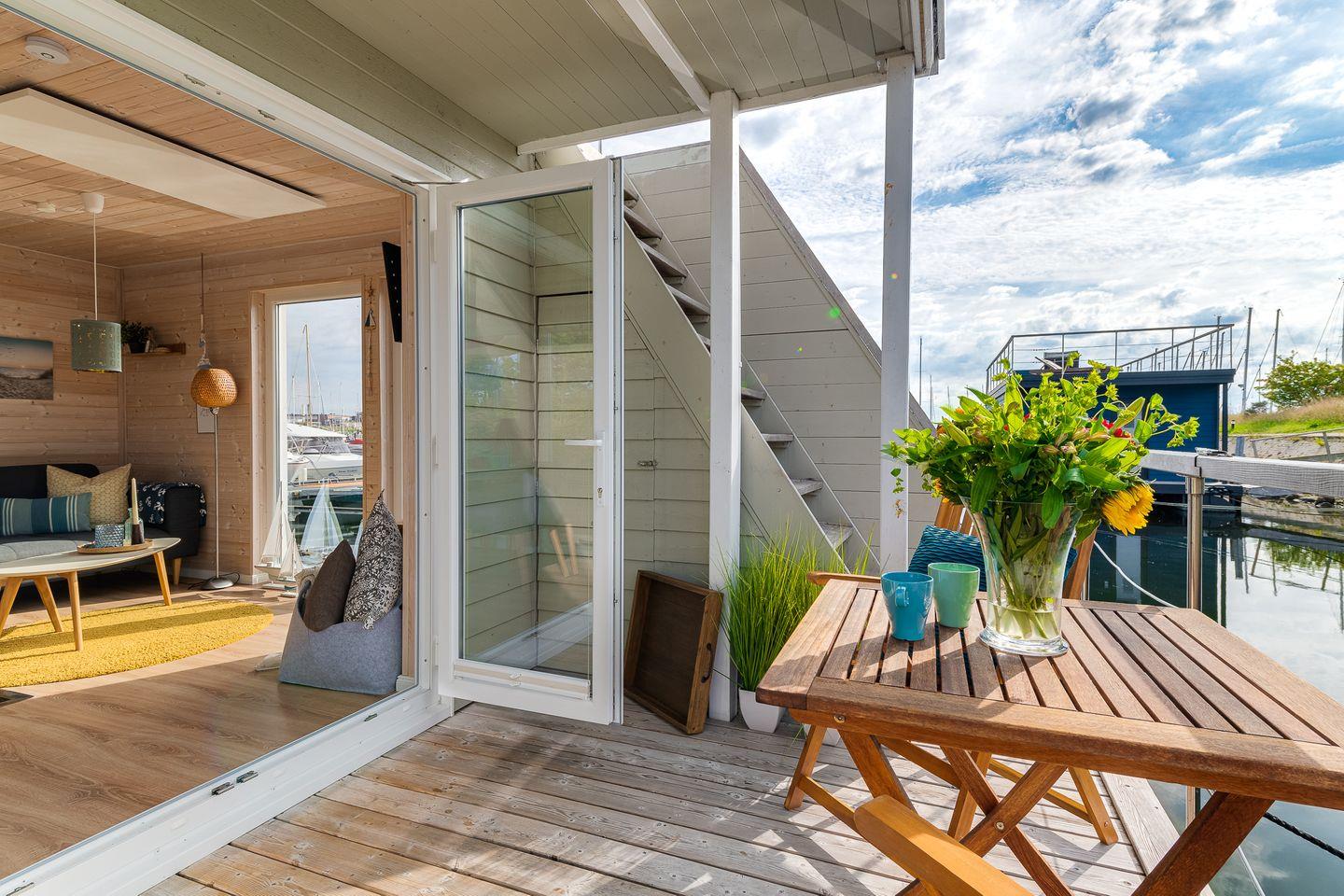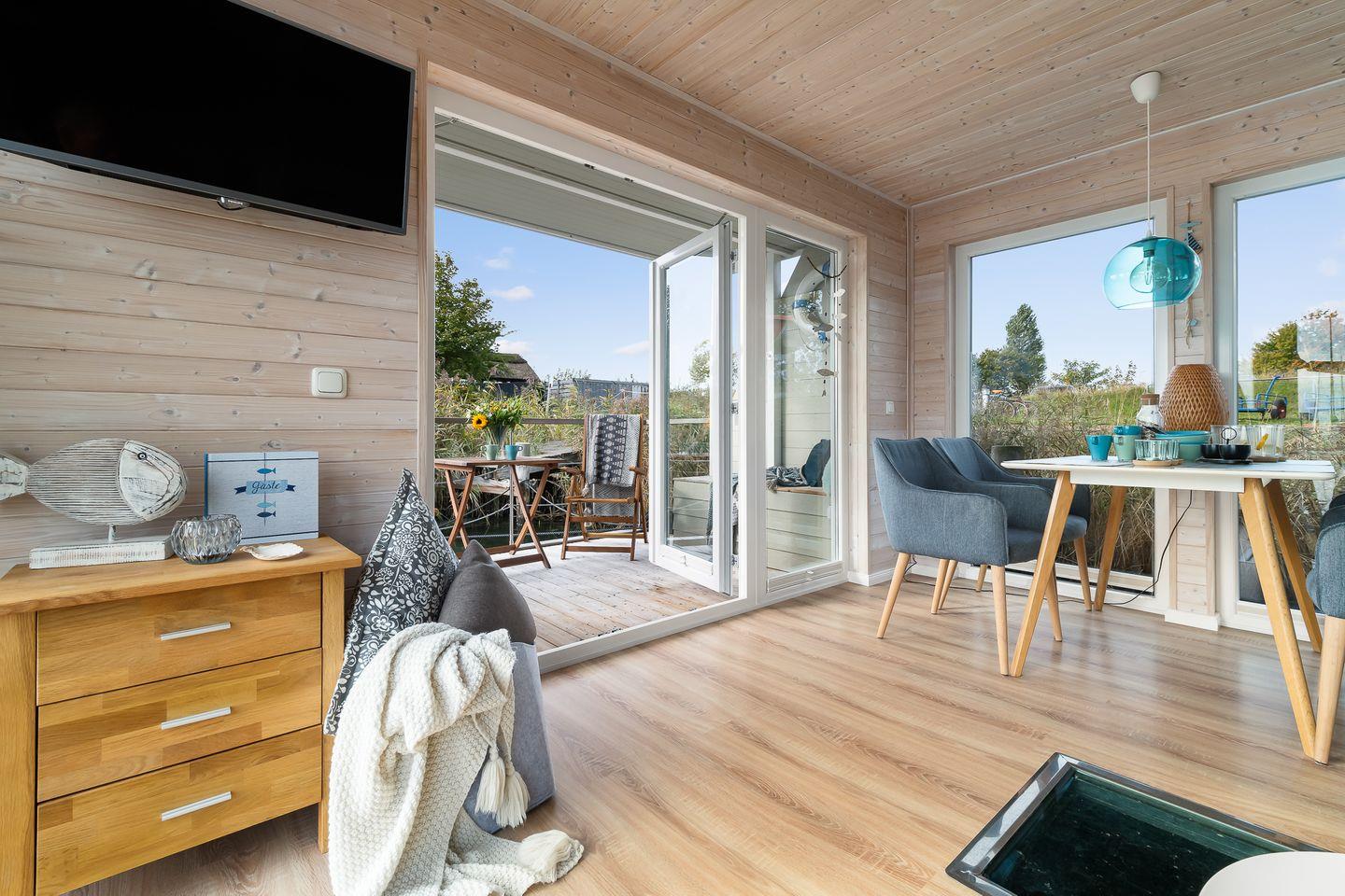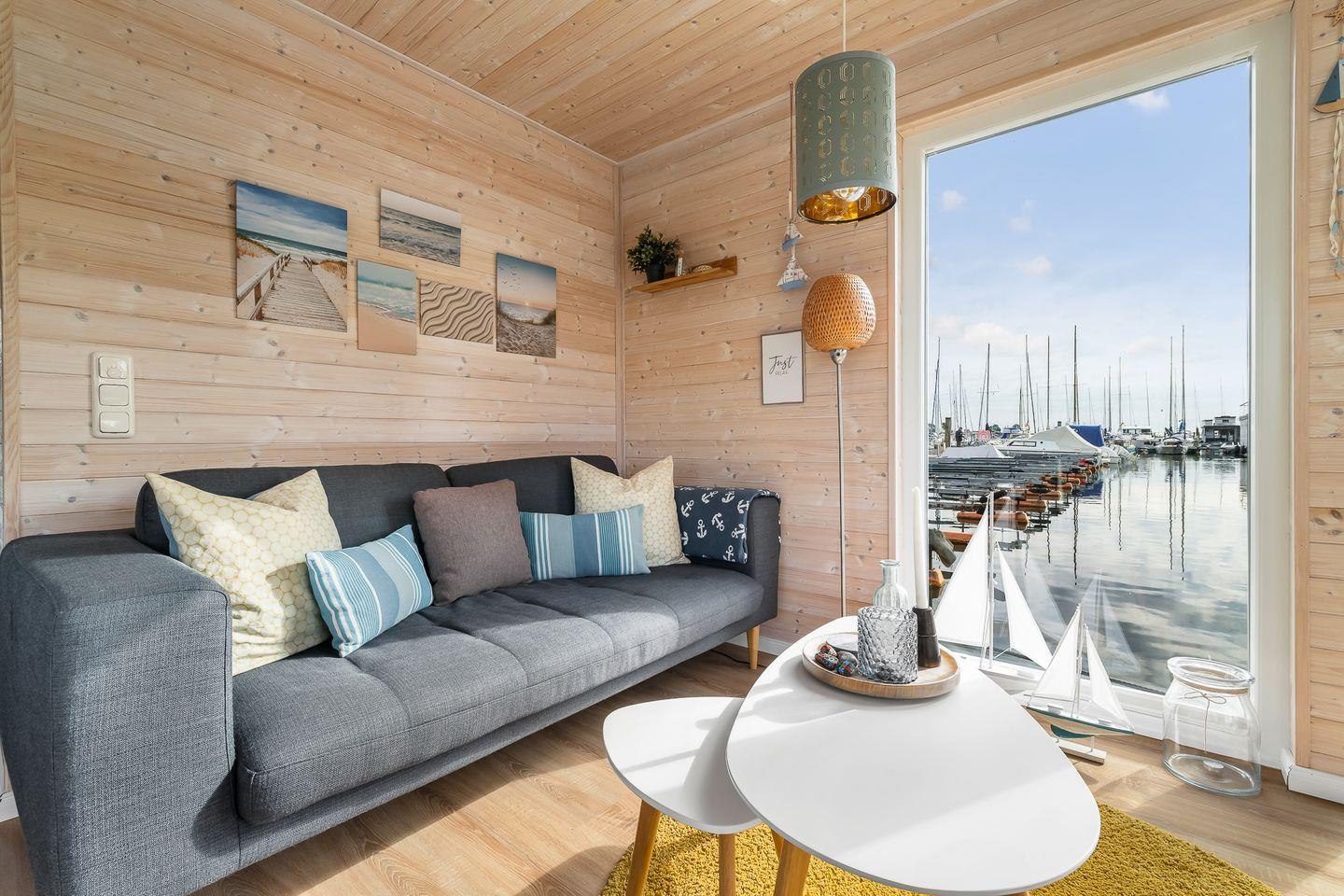Integrierte, sehr gut ausgestattete Küchenzeile mit Gasherd und Mikrowelle, Essplatz direkt am Wasser, offener und gemütlicher Wohnbereich mit Blick auf die Boote. Das beleuchtete Fußbodenfenster ist am Abend natürlich