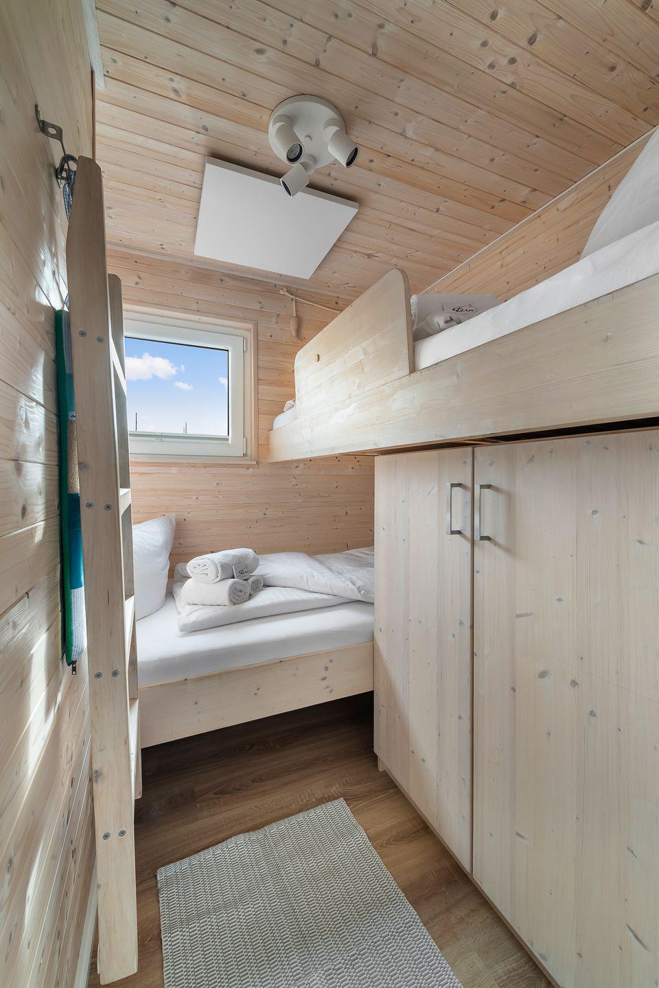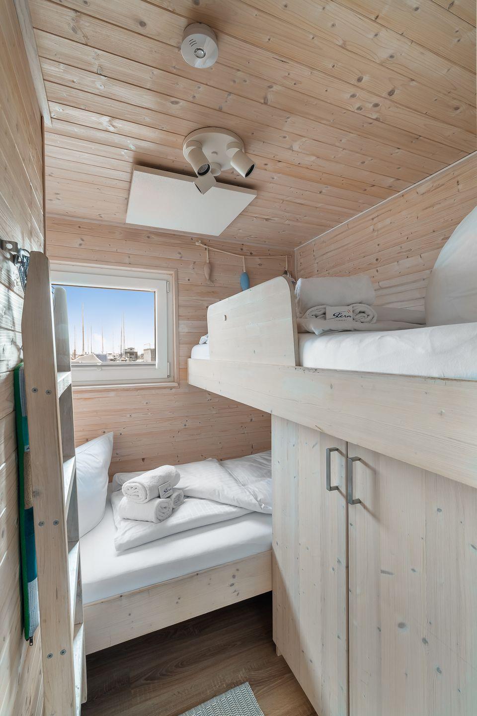 und einmal zwei Einzelbetten (200x90 cm) davon ein Hochbett mit Leiter und Rausfallschutz.