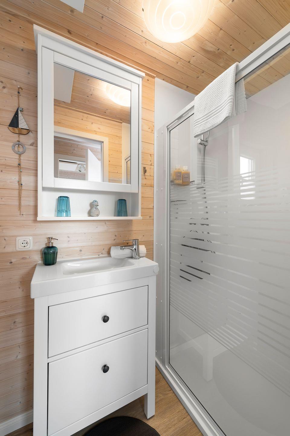 An kühleren Tagen sorgt eine Infrarotheizung in allen Räumen für wohlige Wärme.