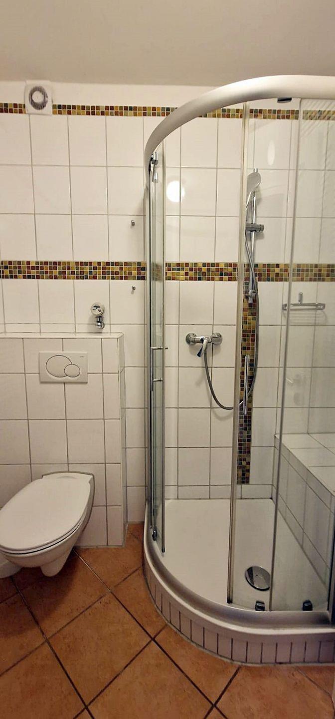 Das Badezimmer wurde ebenfalls modernisiert: die Dusche verfügt über einen niedrigen Einstieg und ist mit einer Glastrennwand ausgestattet.