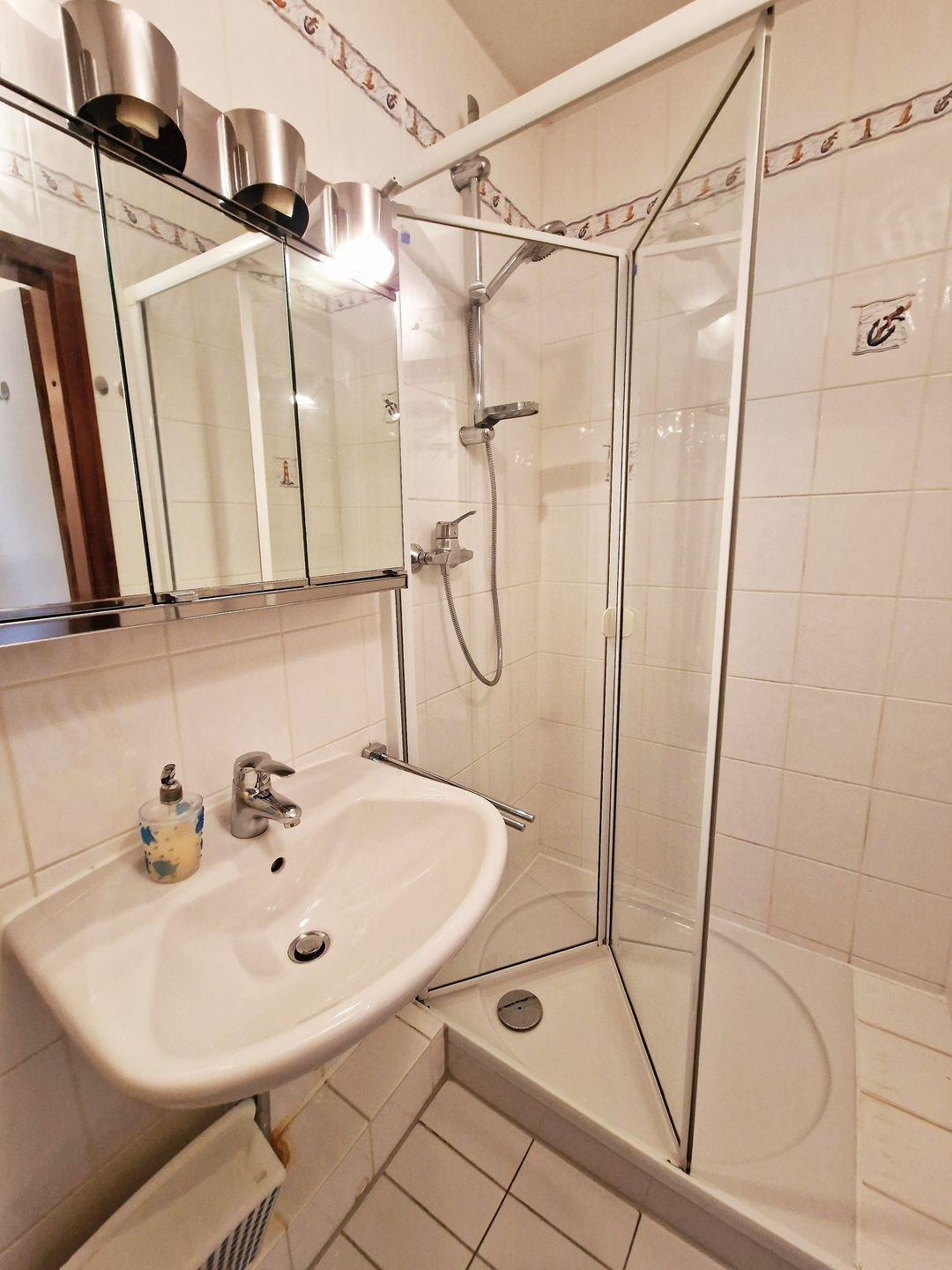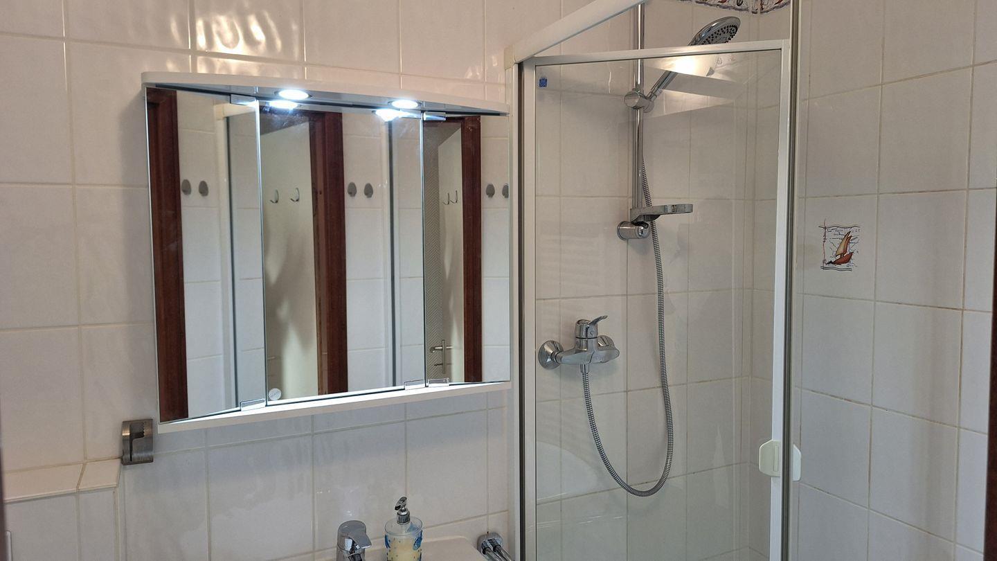 Im innenliegenden Duschbad finden Sie eine Dusche mit flexibler Duschwand und flachem Einstieg. Haartrockner und Handtuchheizkörper sowie beleuchteter Spiegel sind ebenfalls vorhanden.
