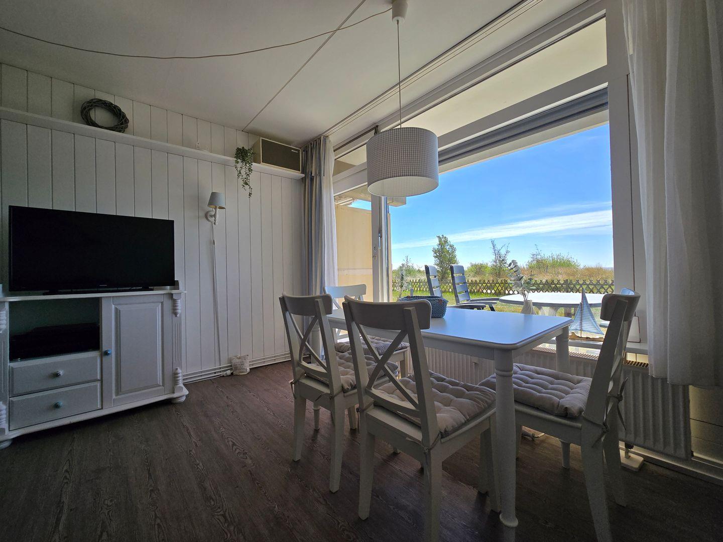 Genießen Sie Ihr zubereitetes Essen, gemütliche Spieleabende oder gute Gespräche am großen Esstisch mit herrlichem Blick auf Dünen, Seebrücke und Meer. Beobachten Sie das Treiben und lauschen Sie dem Meeresrauschen.