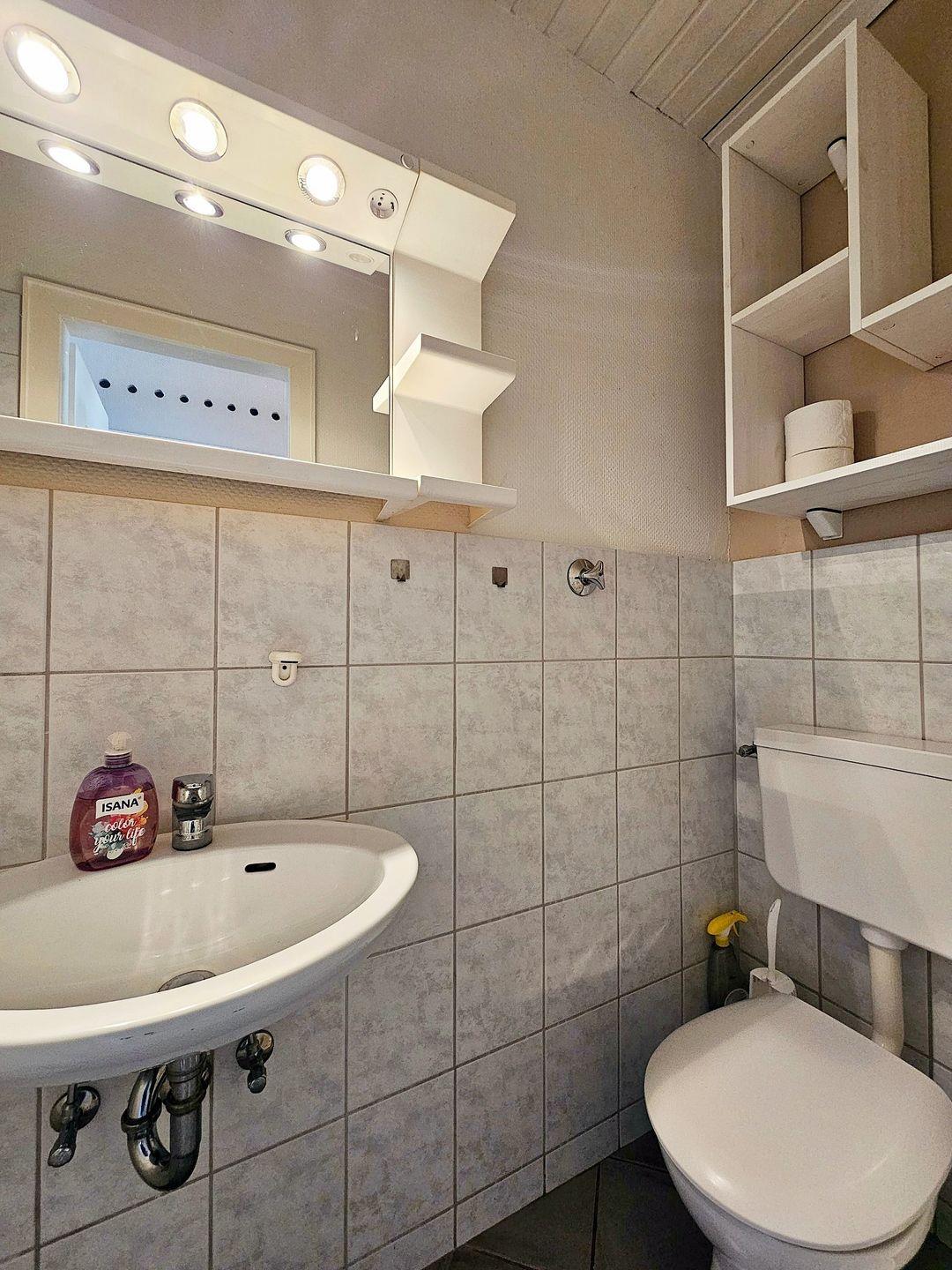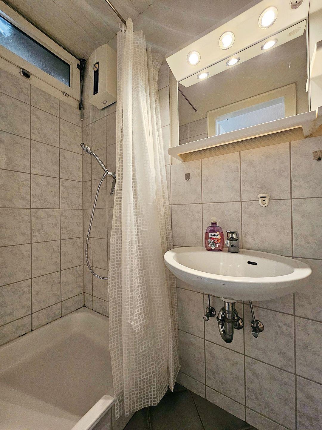 Das kleine funktionale Badezimmer wurde mit Dusche ausgestattet und verfügt ebenfalls über ein kippbares Oberlicht.