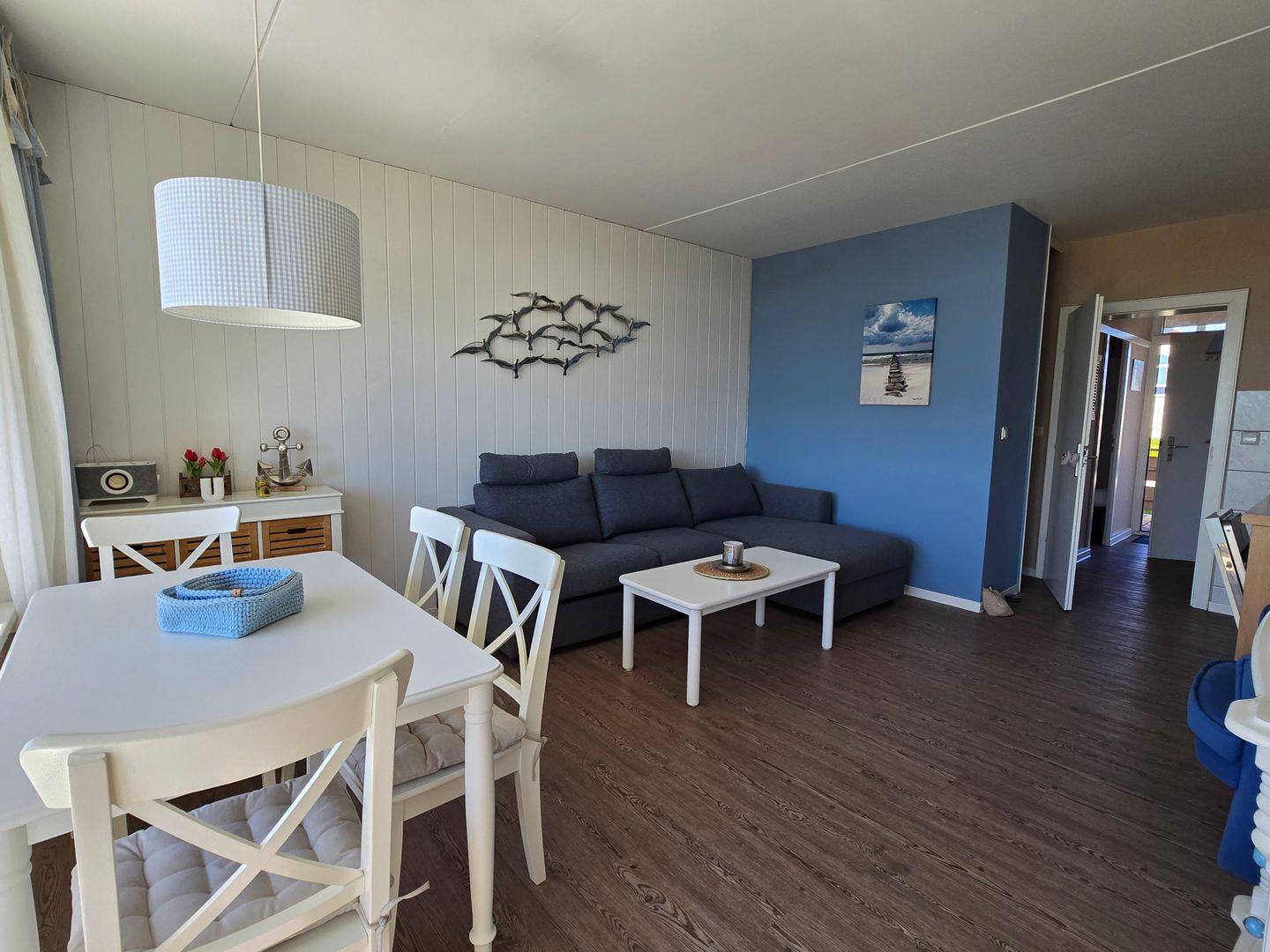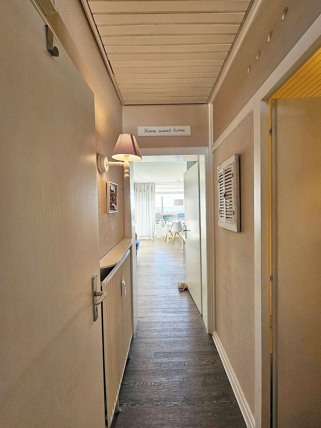 Die hell eingerichtete Wohnung im Erdgeschoss für bis zu 3 Personen empfängt Sie in einem kleinen Flur von dem das Bad und das abgeteilte Schlafzimmer abzweigen.