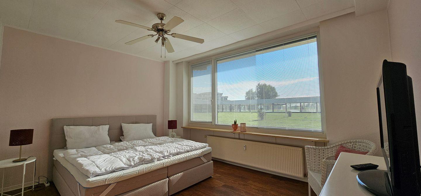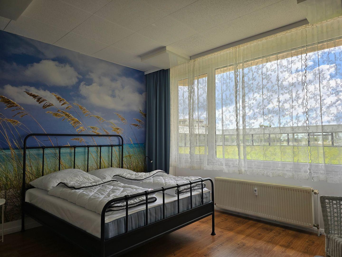 Das Schlafzimmer mit Boxspringbett (180*200 cm) punktet mit einer großen Fensterfront, Nachttischen, ein Sideboard sowie ein Flachbild TV. Bei etwas Wellengang können Sie hier sogar mit Meeresrauschen einschlafen und gut ausgeruht in den nächsten Tag starten.