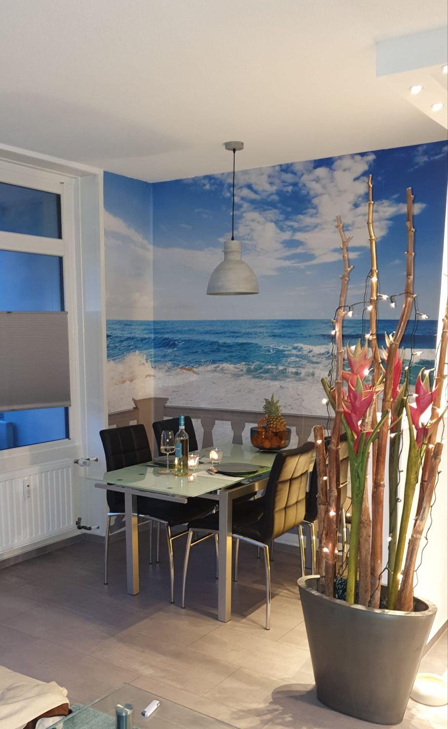Im Wohnbereich lädt Sie eine große Sofaecke zu gemütlichen Abenden ein. Der Glastisch ist mit Rollen versehen, damit Platz geschaffen werden kann, wenn die Couch mit Boxspringqualität zu einer Schlafgelegenheit (1,50m x 2,20m Liegefläche) umgewandelt werden soll. Ein Smart TV Fernseher steht zu ihrer Unterhaltung bereit. Das Streamen über Netflix und Youtube sowie kostenloses Wlan gehören zum Standard dieser Ferienwohnung. Hier kommt auch an sonnenverhangenen Tagen keine Langeweile auf.