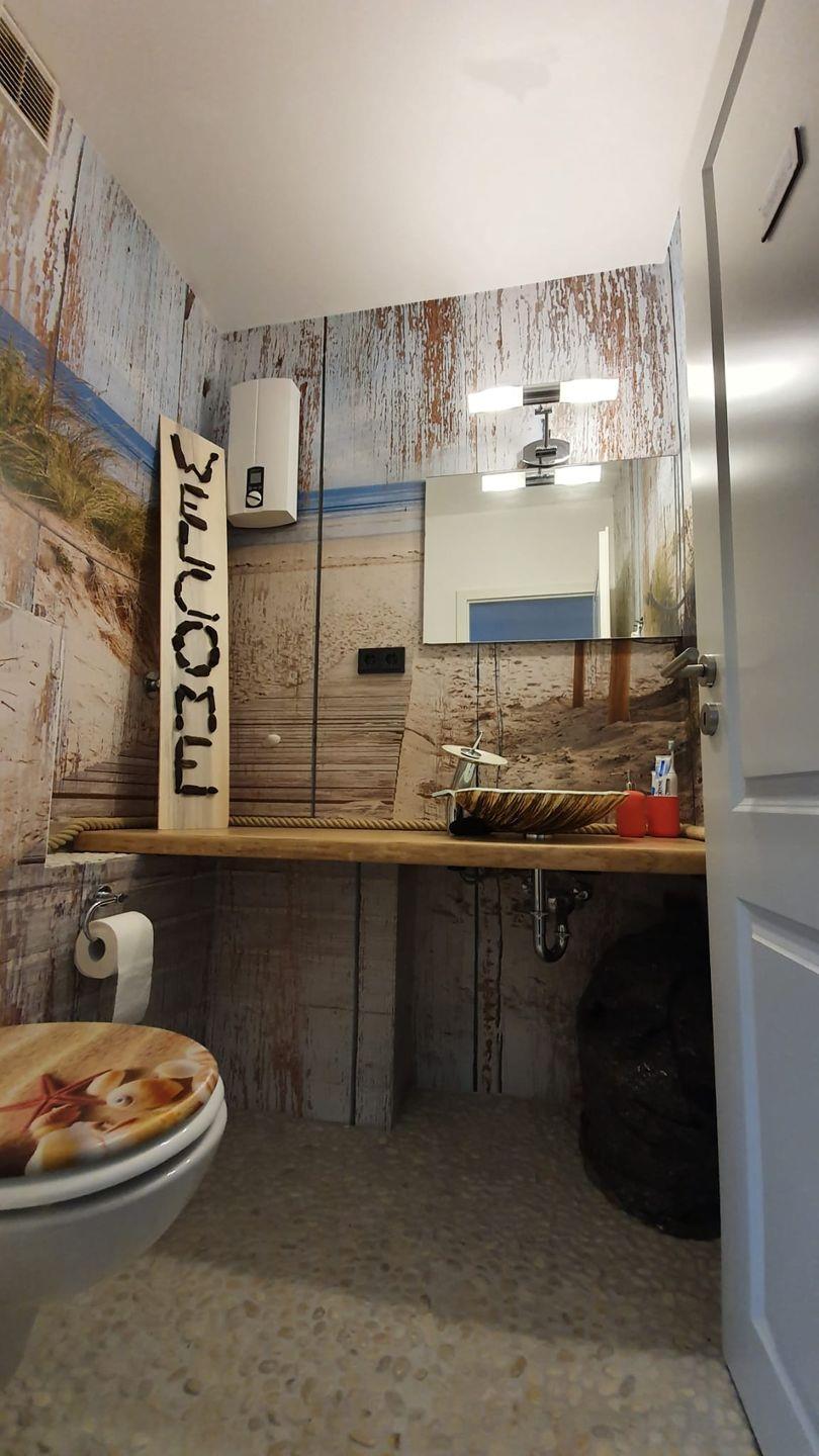 Im Badezimmer befindet sich ein dekoratives Waschbecken, reichlich Ablageplatz und ein beleuchteter Spiegel. Die großzügige Dusche hat einen eigenen Raum und ist ebenerdig. Zum Aufhängen Ihrer Handtücher oder Bademäntel sind hier viele Möglichkeiten vorgesehen. Als kleines Highlight dient die Stimmungsleuchte in der Dusche, die sich mit unterschiedlicher Farbe und Stärke an die Bedürfnisse des jeweiligen Benutzers anpassen lässt.