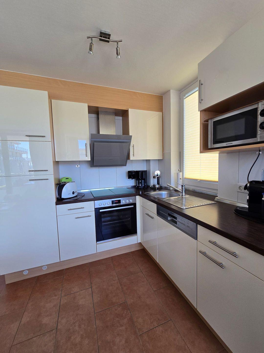 Die Küche ist offen zum Wohnzimmer gestaltet und lädt dazu ein, gemeinsam leckere Gerichte zuzubereiten. Sie ist komplett ausgestattet mit modernen Geräten wie einem Cerankochfeld, Backofen, Kühlschrank mit Gefrierfach und einer Spülmaschine. Hier stehen Ihnen alle Küchenutensilien zur Verfügung, damit Sie sich wie zu Hause fühlen. Für die kleinen Gäste ist zudem ein Kinderhochstuhl vorhanden.