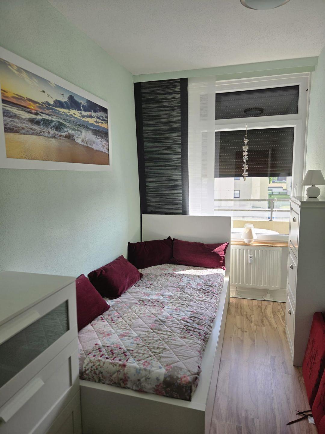 Weiter den Flur entlang findet sich linksseitig die kleine moderne Einbauküche. Ein Raum weiter das zweite Schlafzimmer mit großem Fenster. und gemütlichem Einzelbett.
