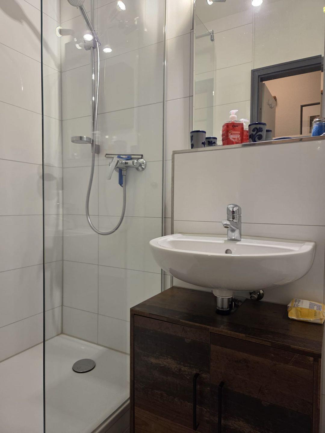 Eine Tür weiter erreichen Sie das helle, freundliche Bad mit einem 1,20 m breiten Duschbereich. Zentral das moderne Waschbecken, rechtsseitig die Toilette. Auch ein elektrischer Handtuchtrockner befindet sich im Bad.