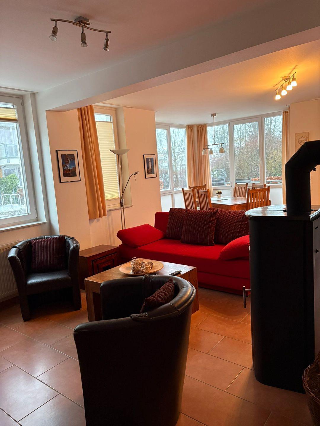 Der helle, freundlich gestaltete Wohnbereich mit Essecke, Kaminofen und Fußbodenheizung schafft eine behagliche Atmosphäre. Für Unterhaltung sorgen ein LCD-Fernseher, eine HiFi-Anlage mit allen gängigen Anschlüssen für Ihre Musik sowie ein DVD-Player.