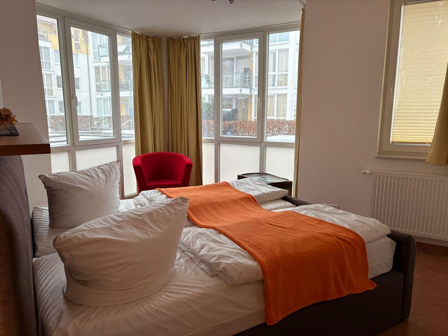 Die Wohnung verfügt über zwei Schlafzimmer mit komfortablen Boxspringbetten und bietet Platz für bis zu vier Personen. Für Gäste, die ihre Bettwäsche selbst mitbringen möchten, ist wichtig zu wissen: Die Boxspringbetten bestehen jeweils aus zwei einzelnen Matratzen (90 x 200 cm). Aus einem der Schlafzimmer genießen Sie einen Blick auf das ca. 80 m entfernte Meer, zudem ist dort ein weiterer Fernseher vorhanden.