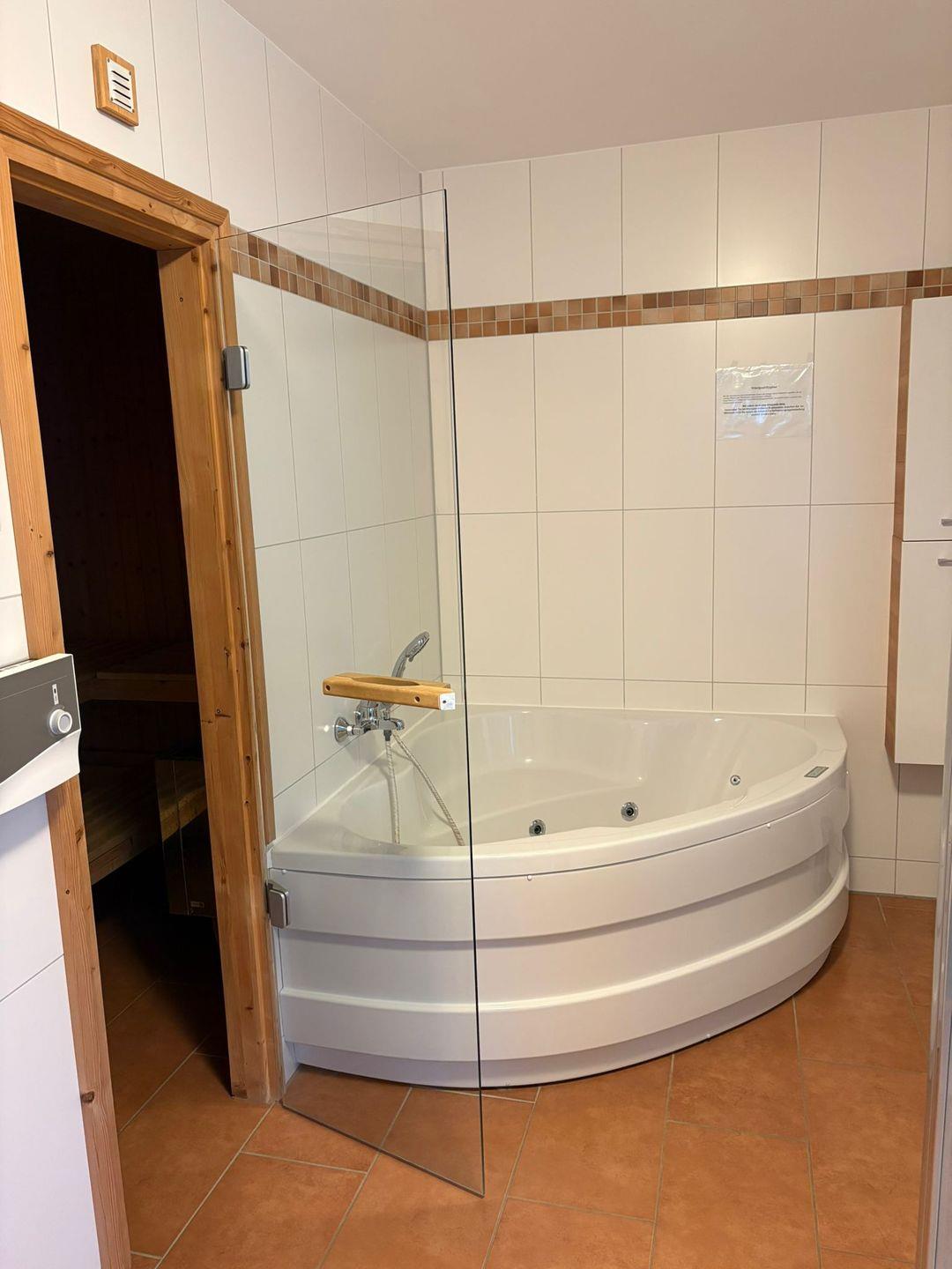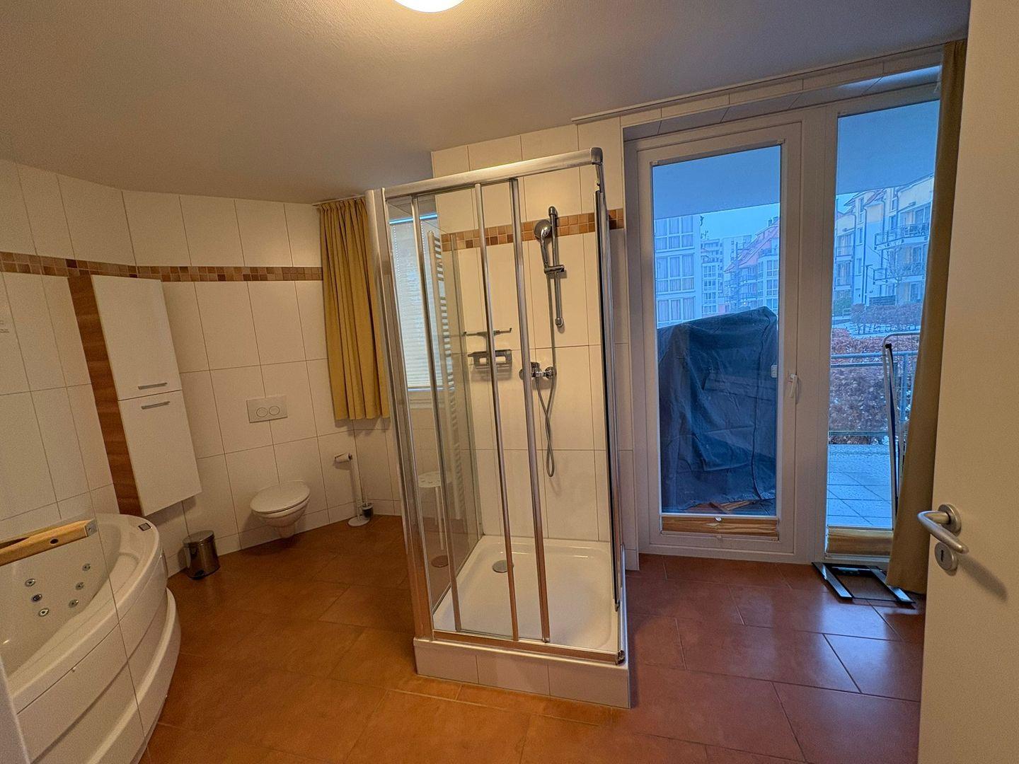 Ein besonderes Highlight ist das ca. 15 qm große Wellnessbad mit Doppelwaschtisch, Whirlpool, Dusche, WC und großzügiger Sauna. Zusätzlich steht Ihnen ein weiteres Bad mit Dusche und WC zur Verfügung.