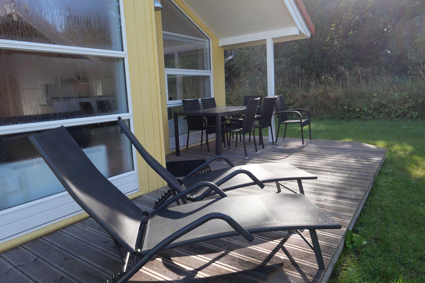 Vom Wohnbereich aus haben Sie Zugang zur teils überdachten, mit Gartentisch und Stühlen möblierten Terrasse, auf der Sie die langen Sommerabende genießen können. 2 Sonnenliegen stehen Ihnen ebenfalls zur freien Verfügung.