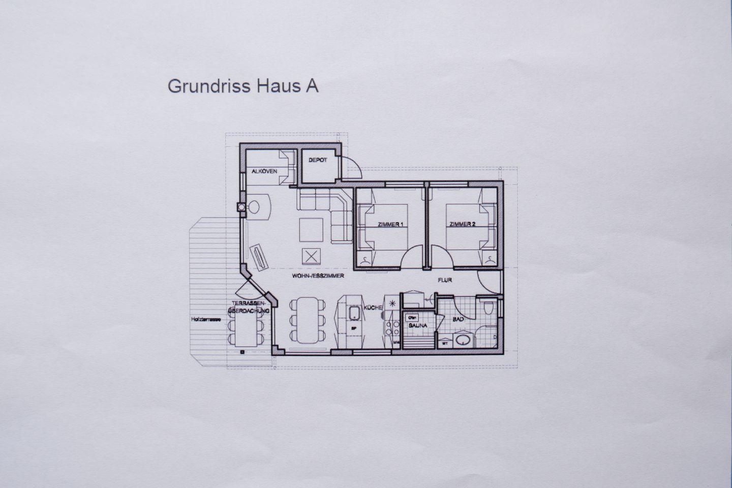 Der offene Wohn- und Küchenbereich sorgt für ein großzügiges Wohngefühl, ein gemütliches Sofa lädt zum Chillen ein und am großen Esstisch genießen Sie Ihre selbstgekochten kulinarischen Highlights. Im Wohnbereich befinden sich der Flachbild Sat-TV, ein DVD-Player bzw. Blue-Ray Player, eine Stereoanlage mit Radio.