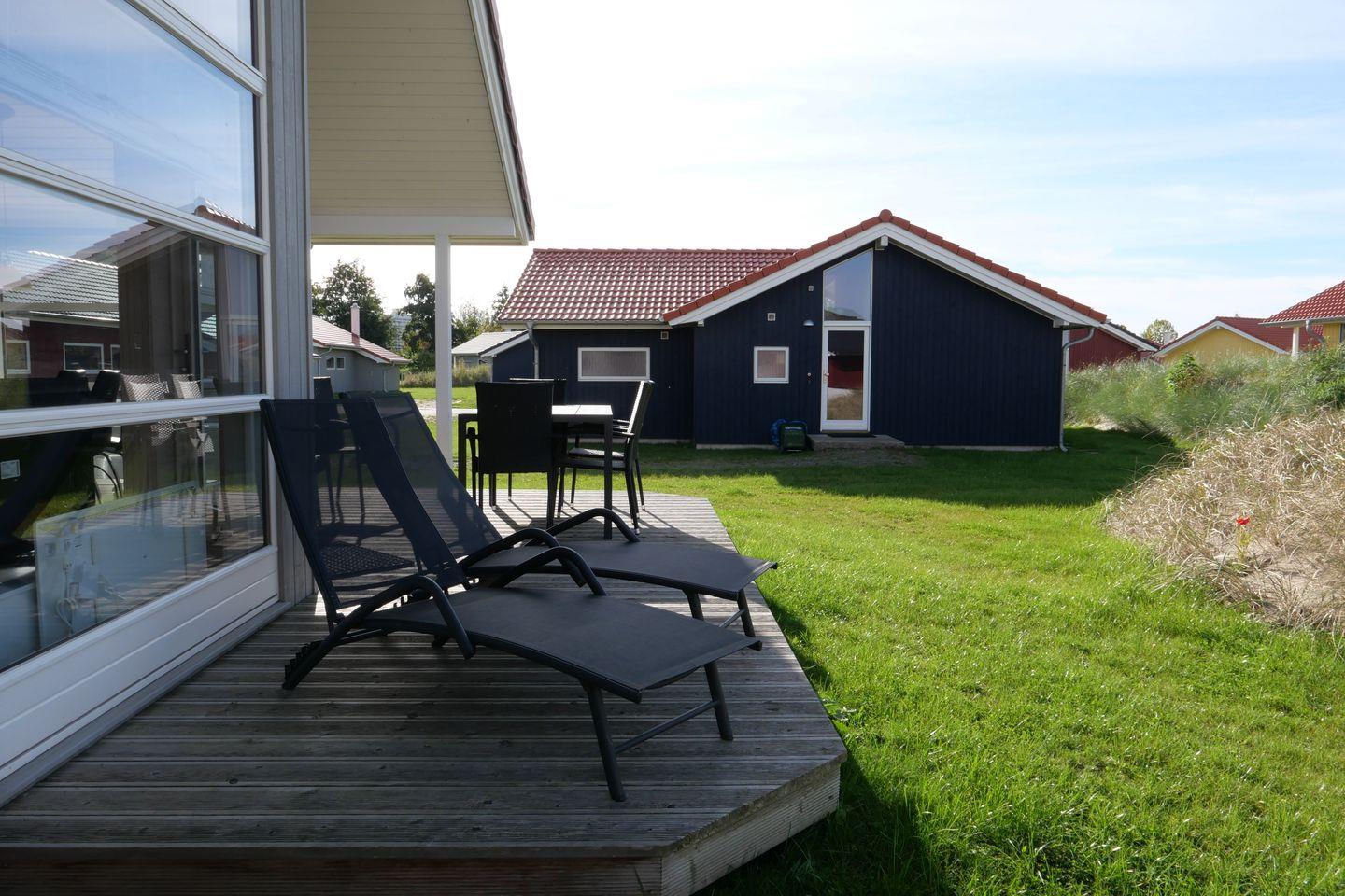 Bitte beachten Sie: Manche Häuser verfügen über ein Geländer um die Terrasse herum, andere nicht. Bei den Außen- und Innenbildern handelt es sich um Modellbilder unterschiedlicher Ferienhäuser.