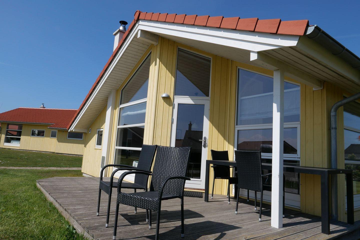 Bitte beachten Sie: Manche Häuser verfügen über ein Geländer um die Terrasse herum, andere nicht. Bei den Außen- und Innenbildern handelt es sich um Modellbilder unterschiedlicher Ferienhäuser.