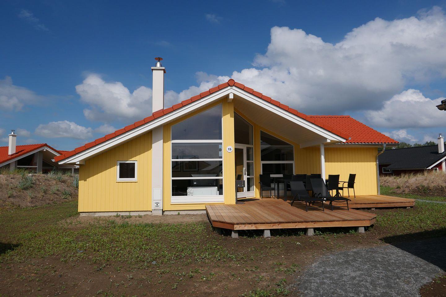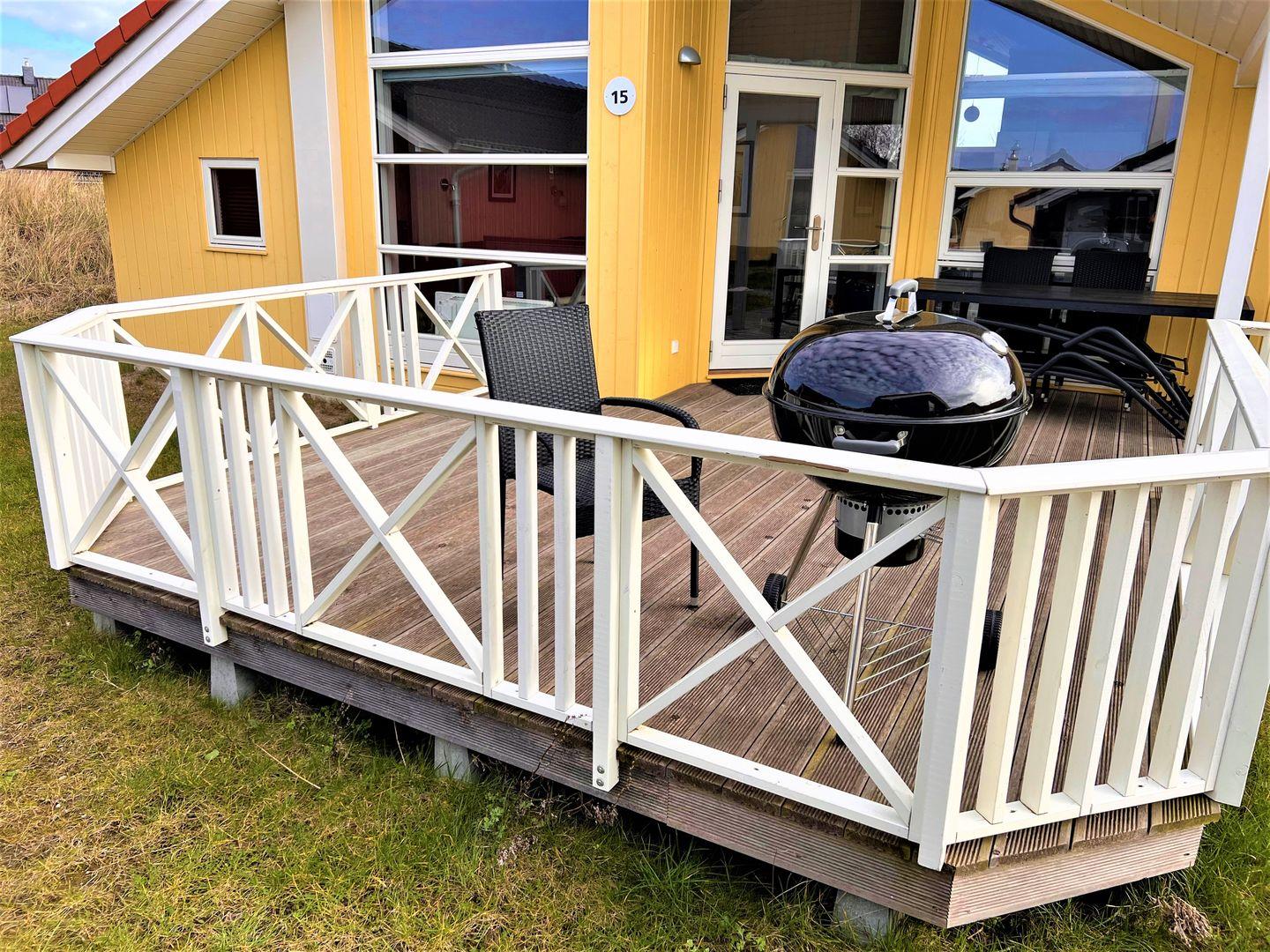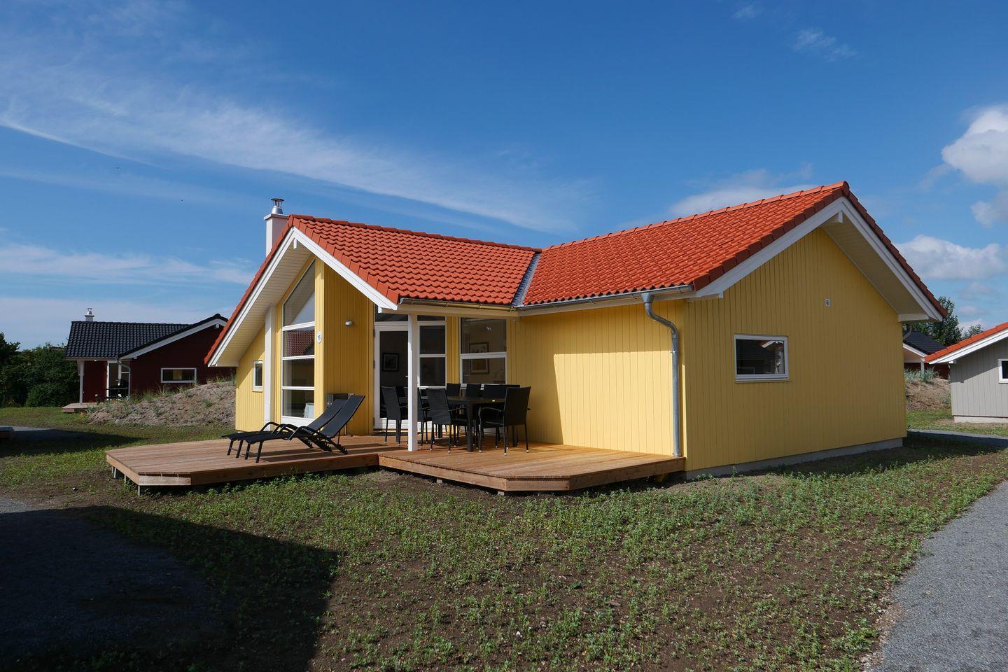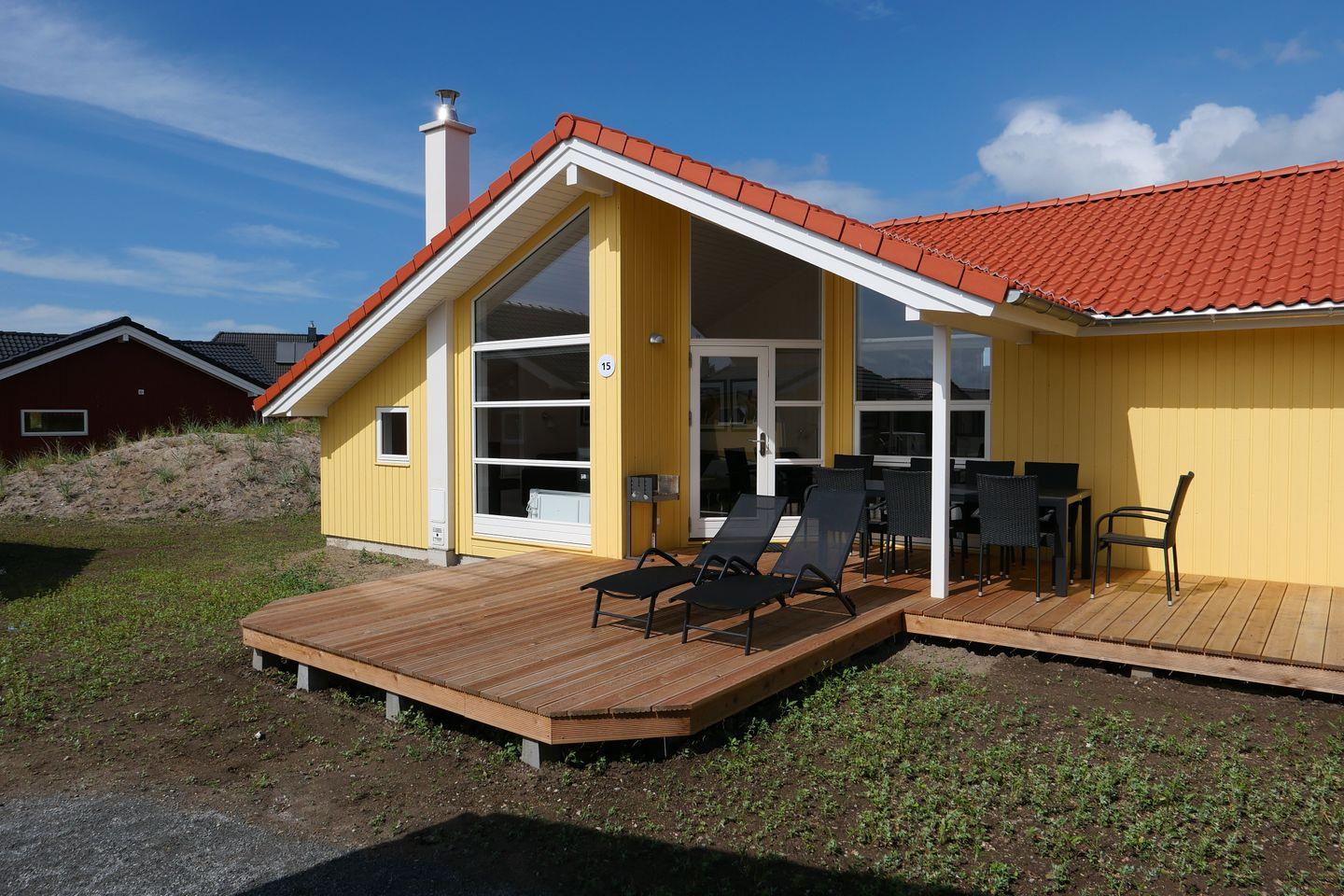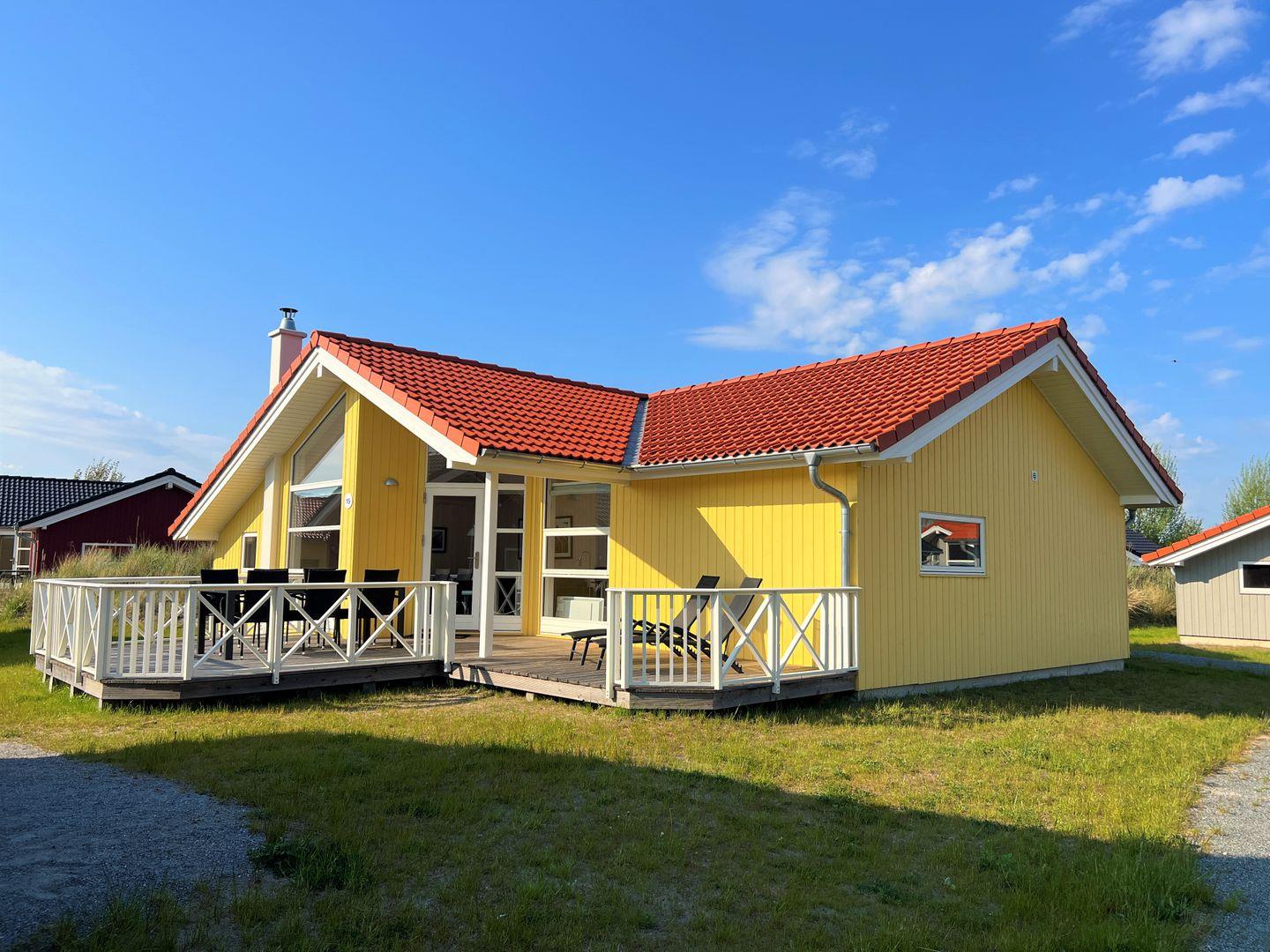 Bitte beachten Sie: Manche Häuser verfügen über ein Geländer um die Terrasse herum, andere nicht. Bei den Außen- und Innenbildern handelt es sich um Modellbilder unterschiedlicher Ferienhäuser.
