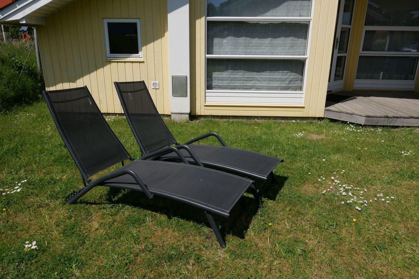 Vom Wohnbereich gelangen Sie auf die teils überdachte, möblierte Terrasse mit Gartentisch, Stühlen und zwei Sonnenliegen – ideal für entspannte Sommerabende.