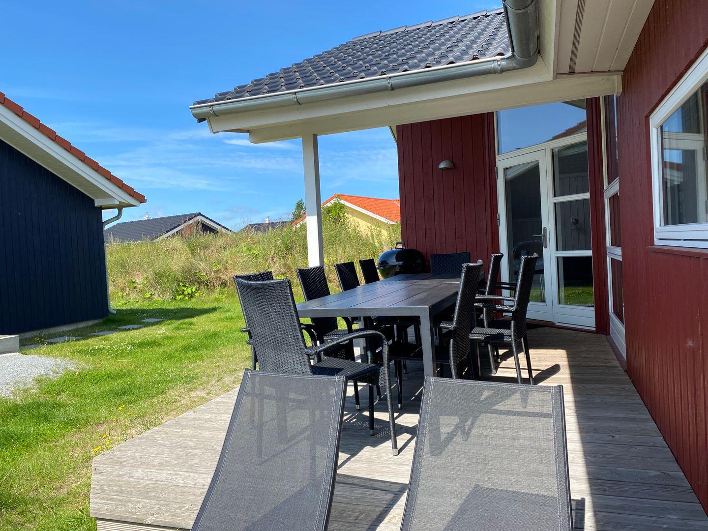 Im Wohnbereich befinden sich der Kaminofen, das Sat-TV, ein DVD-Player bzw. Blue-Ray Player, eine Stereoanlage mit Radio. Vom Wohnbereich aus haben Sie Zugang zur teils überdachten, mit großem Gartentisch und Stühlen möblierten Terrasse, auf der Sie die langen Sommerabende genießen können. 2 Sonnenliegen stehen Ihnen ebenfalls zur freien Verfügung.