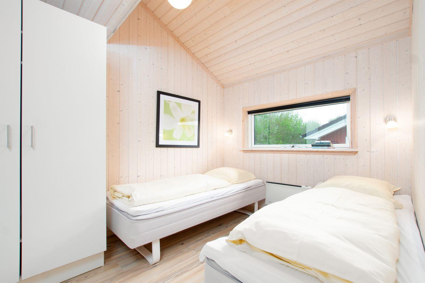 Die zwei Bereiche mit insgesamt 4 Schlafzimmern sind räumlich voneinander getrennt und auf gegenüberliegenden Seiten des Hauses platziert. Jeder Schlafbereich beinhaltet jeweils ein Schlafzimmer mit Doppelbett und ein Schlafzimmer mit zwei Einzelbetten. Über einem der Schlafbereiche gibt es zwei extra Schlafplätze auf dem Hems, eine Art Schlafboden. Hier tummeln gerne die Kinder. Zu beiden Schlafbereichen gehört jeweils ein Bad. Das große Badezimmer ist mit Whirlpool, Sauna und Dusche ausgestattet und das kleinere Bad mit Dusche. Ein Kinderbett und ein Kinderhochstuhl befinden sich im Haus.