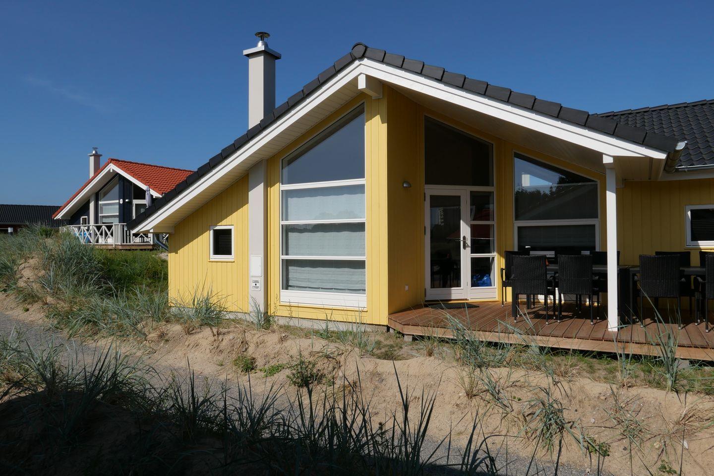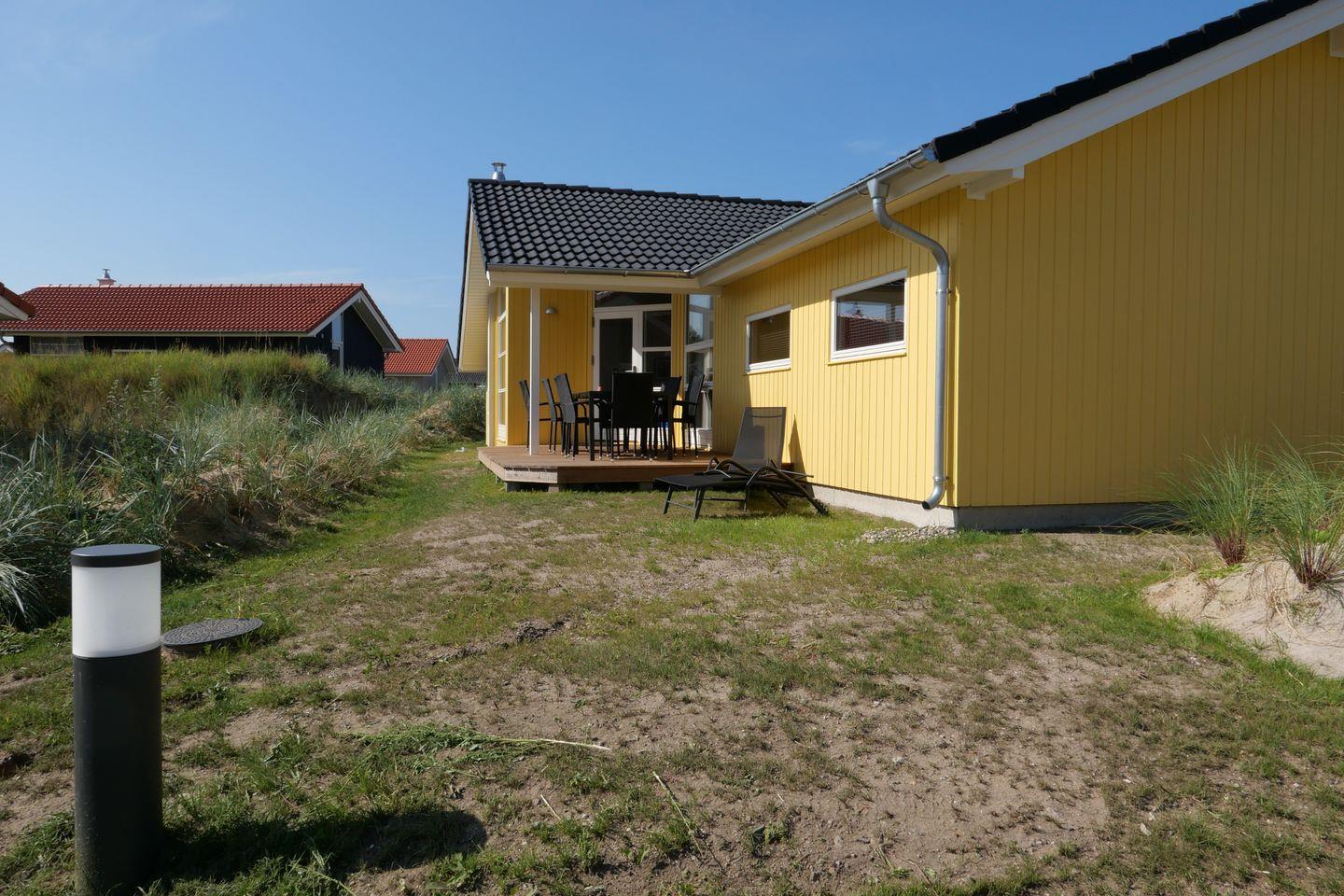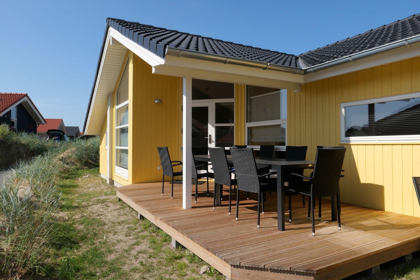 Bitte beachten Sie: Manche Häuser verfügen über ein Geländer um die Terrasse herum, andere nicht. Bei den Außen- und Innenbildern handelt es sich um Modellbilder unterschiedlicher Ferienhäuser.