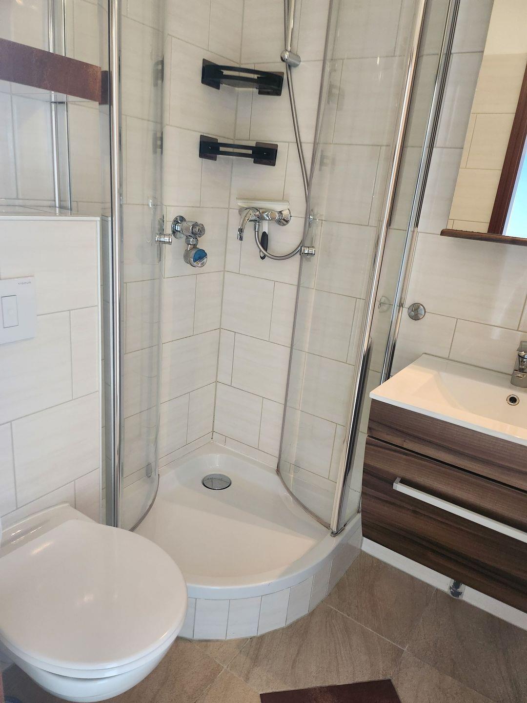 Auch das moderne, innenliegende Duschbad mit Glasduschkabine, Handtuchheizkörper und beleuchtetem Spiegelschrank wurde durchdacht modernisiert – hier startet ihr perfekter Urlaubstag!
