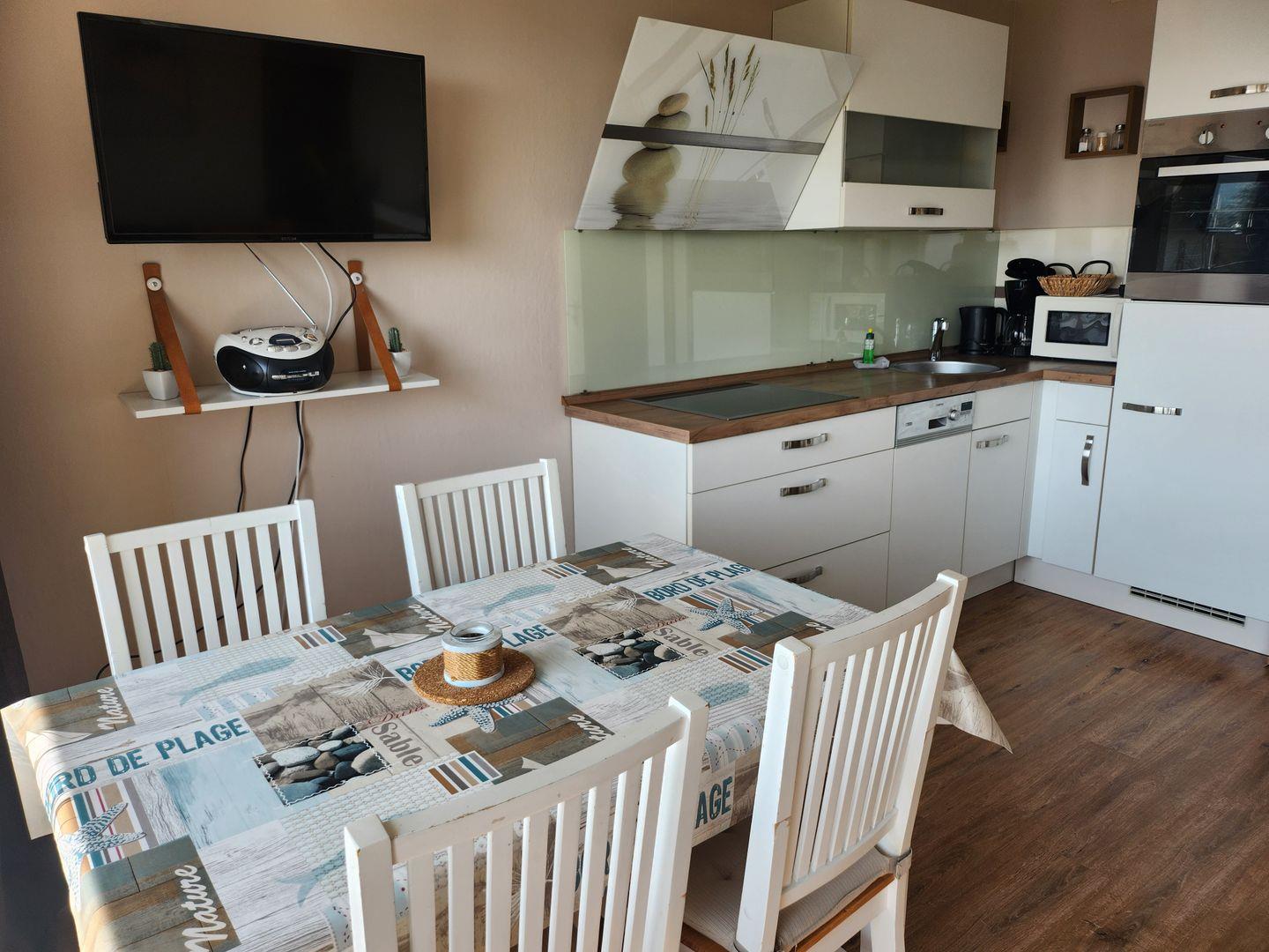 Die neue, moderne Küche bietet Ihnen den Komfort den Sie von Zuhause kennen: Backofen, 4-fach Cerankochfeld, Geschirrspüler und ein großer Kühlschrank finden hier Platz. Genießen Sie vom anschließenden Essbereich am Fenster den herrlichen Meerblick aus dem 4. Stock. Im Abstellraum steht ein kleiner Tiefkühlschrank für Gefrorenes bereit.