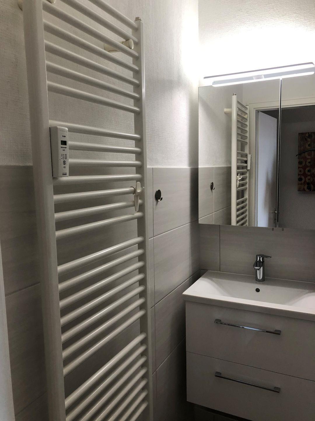 Das modern sanierte, innenliegende Duschbad verfügt über einen beleuchteten Spiegelschrank, einen Handtuchheizkörper, Waschbeckenunterschrank mit Schubladen und eine Dusche mit Wanne und Duschvorhang.
