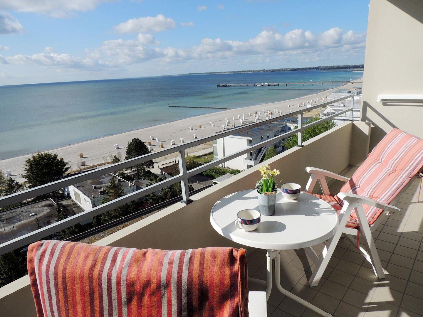 Vom Balkon genießen Sie aus dem 8. Stock den direkten, atemberaubenden Blick auf das glitzernde Meer zu Ihren Füßen. Gemütliche Hochlehner mit Polsterauflagen und ein Bistrotisch laden zum Entspannen, Krafttanken und Sonnen ein.