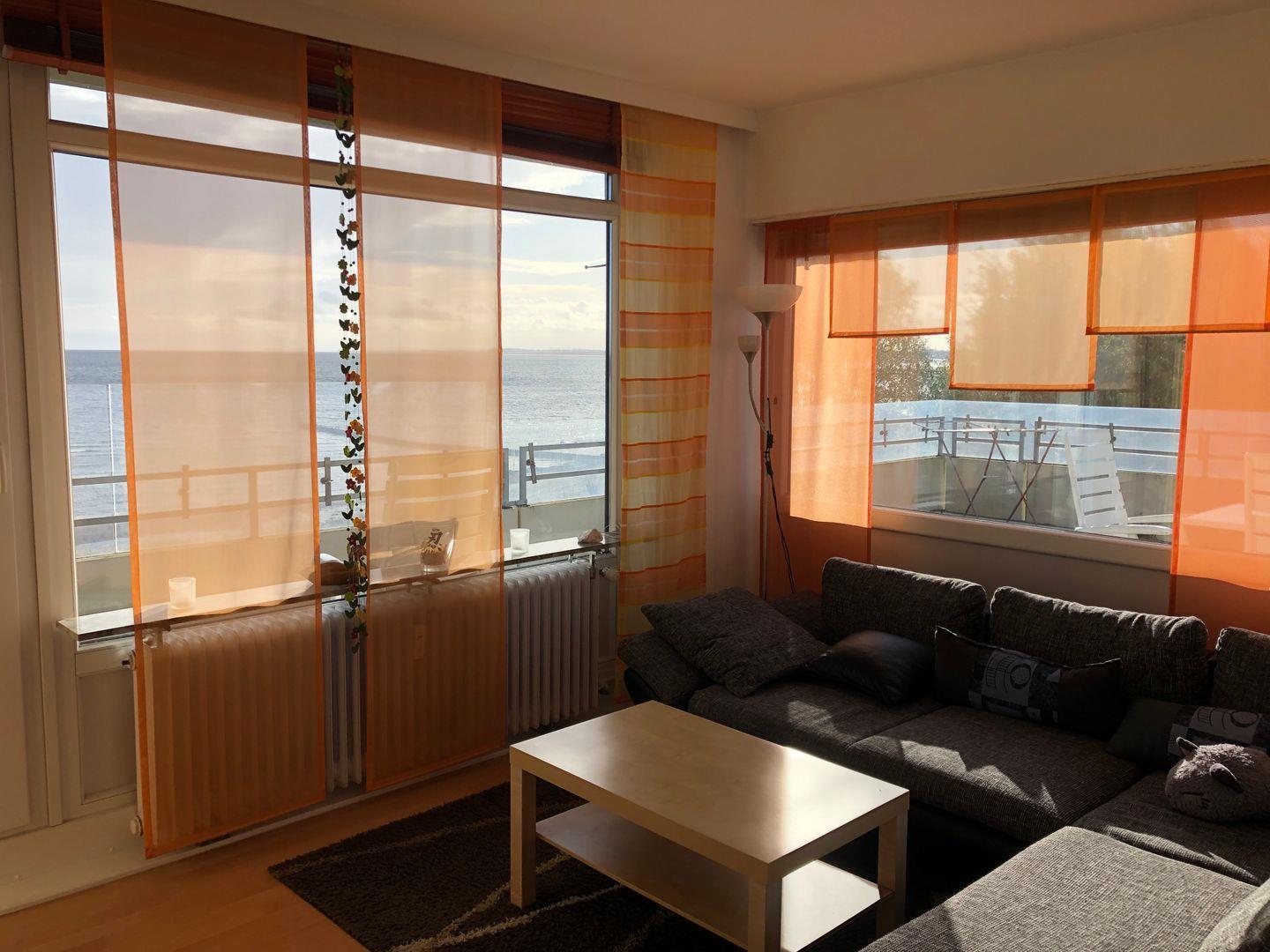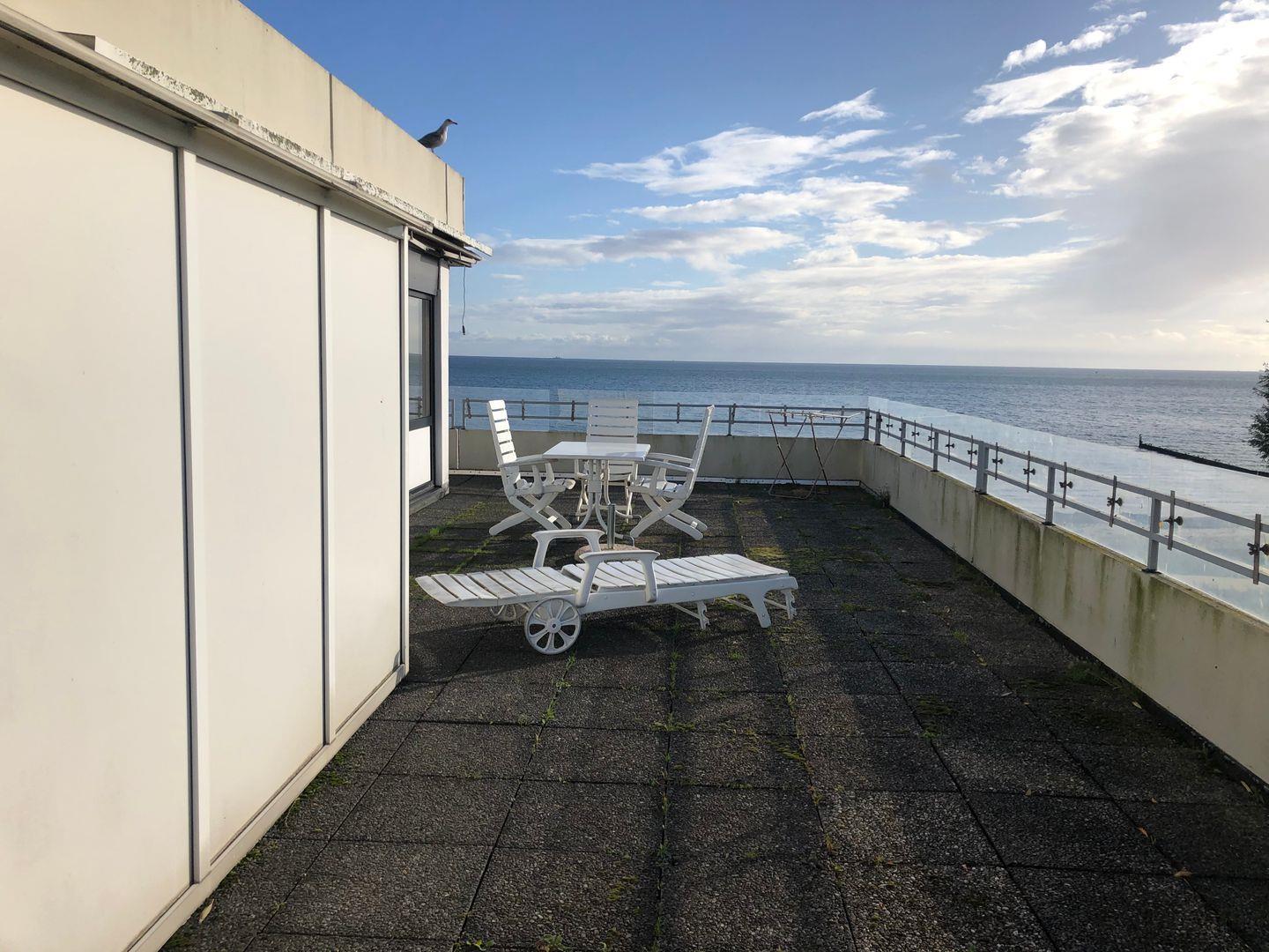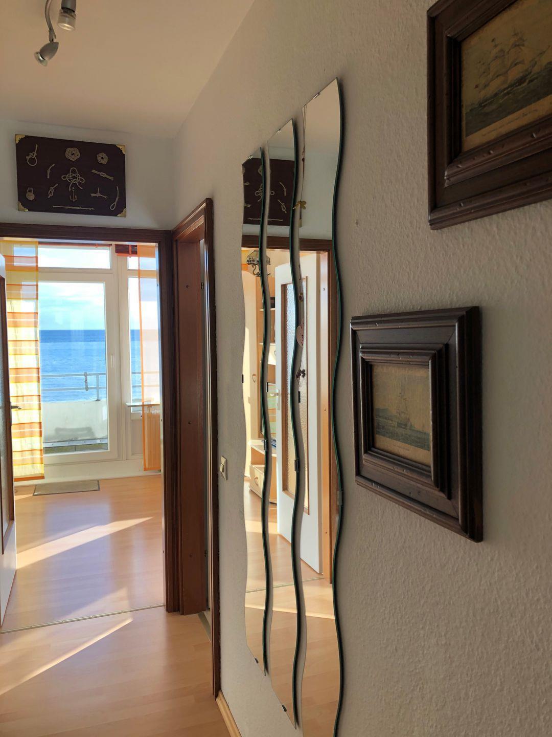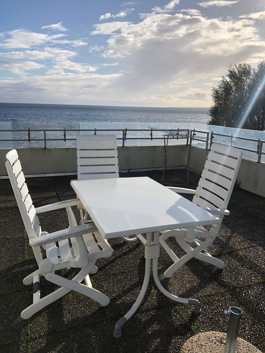 Durch die besondere Lage verfügt die helle Eckwohnung im 3. uns somit obersten Stock über viele Fenster und Zugänge zu der besonders großen Eck-Dachterrasse. In erster Baureihe am Strand haben Sie von hier einen unverbauten, fantastischen Meerblick und zu jeder Tageszeit die Möglichkeit ein sonniges und geschütztes Plätzchen zum Entspannen zu finden. Die Dachterrasse ist umfassend möbliert: Sonnenliegen, Sonnenschirm, Hochlehner mit Auflagen und ein großer Tisch laden Sie -auch mit Gästen- ein, Ihren Aufenthalt bei schönstem Wetter draußen zu genießen.