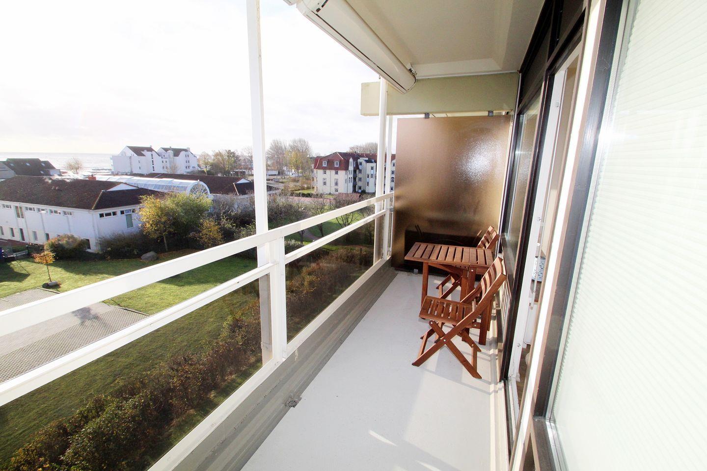 Auf dem, mit Holzmöbeln ausgestatteten, Balkon können Sie von morgens bis abends die Sonne genießen. Falls es dann mal zu warm wird: zwei elektrische Markisen spenden nach Betätigung der Fernbedienung Schatten.