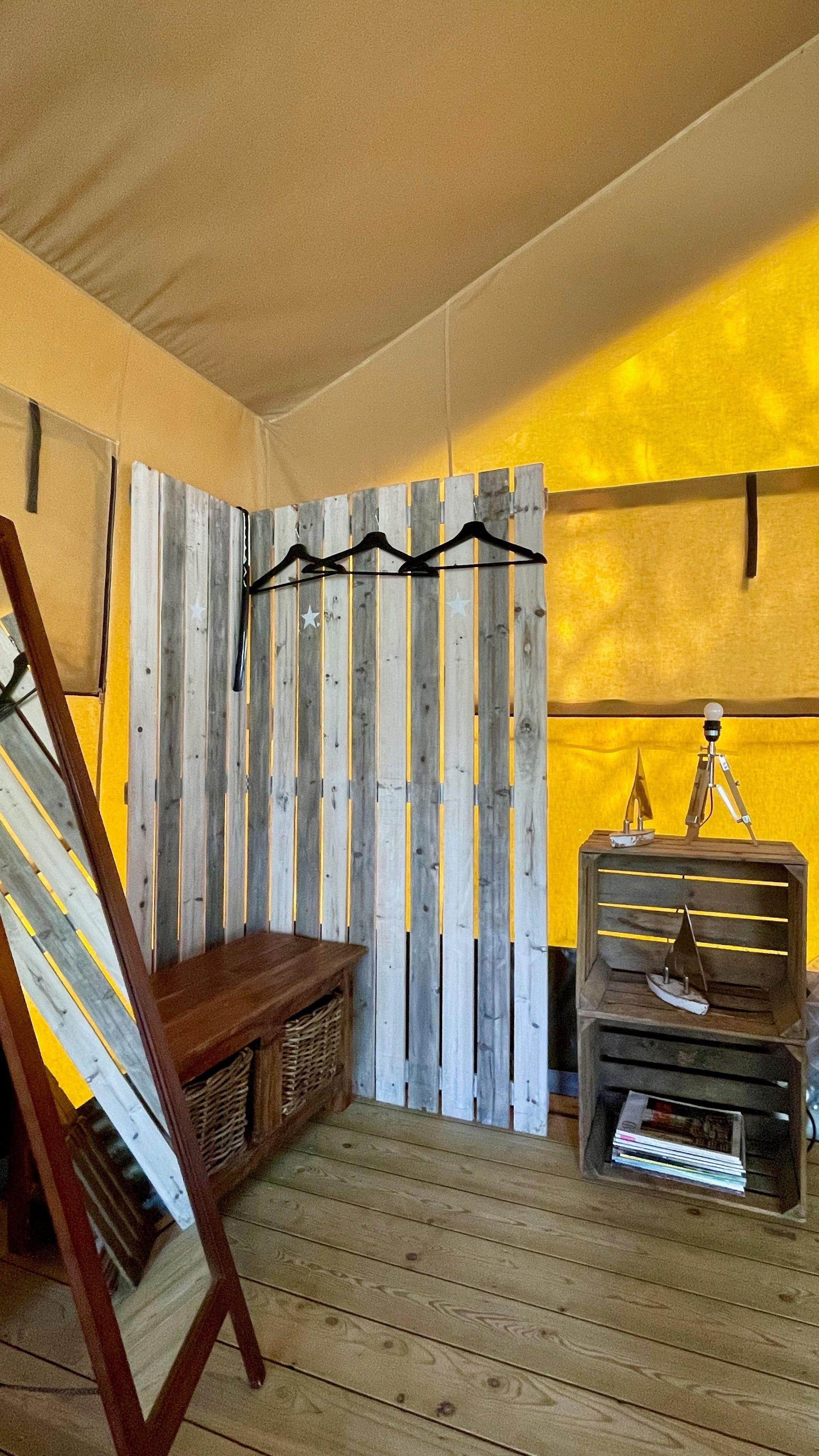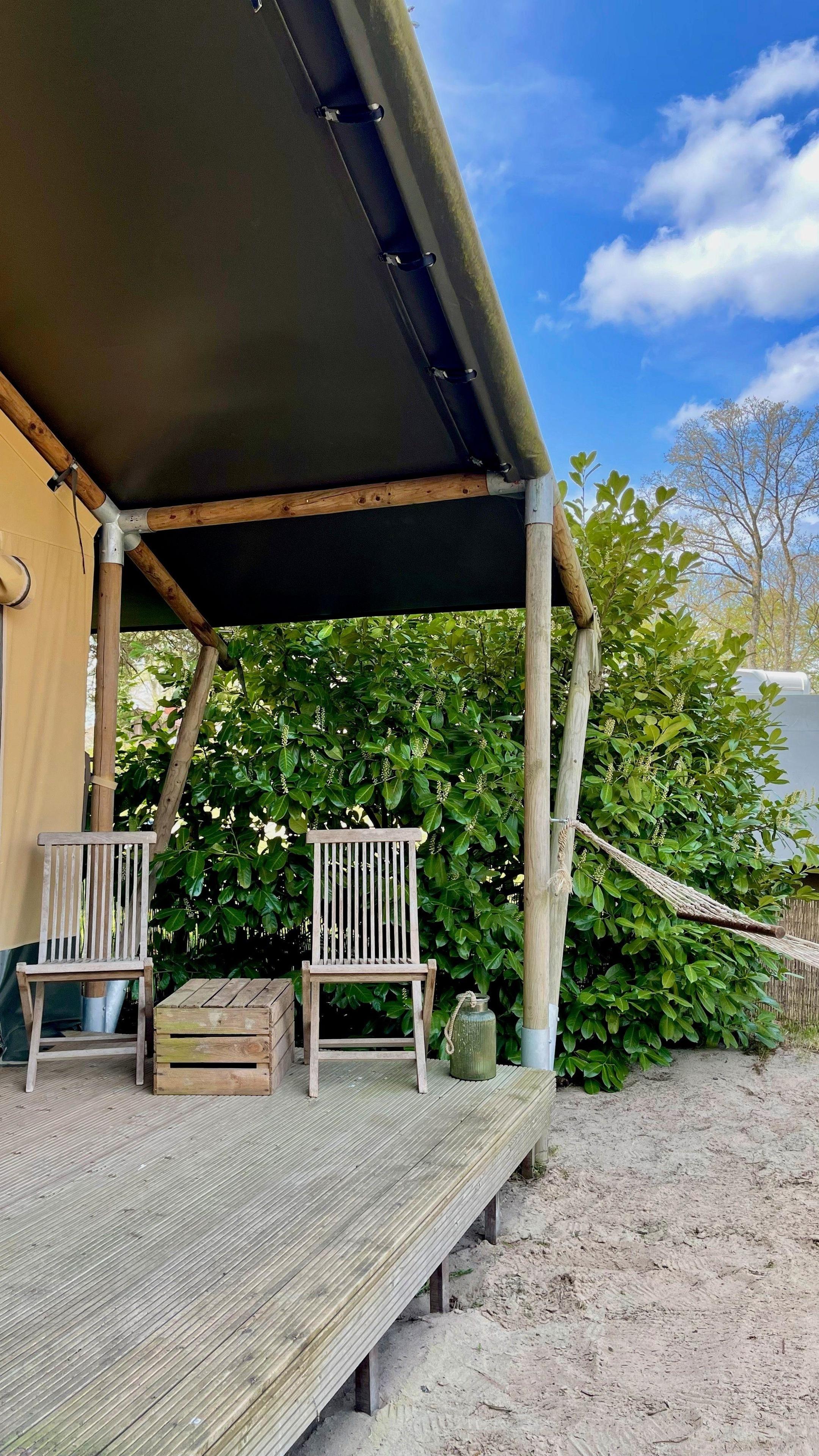 Das Safari Zelt verfügt über ein Himmelbett, Kronleuchter, Essecke, Loungesessel, eine überdachte Außenterrasse.