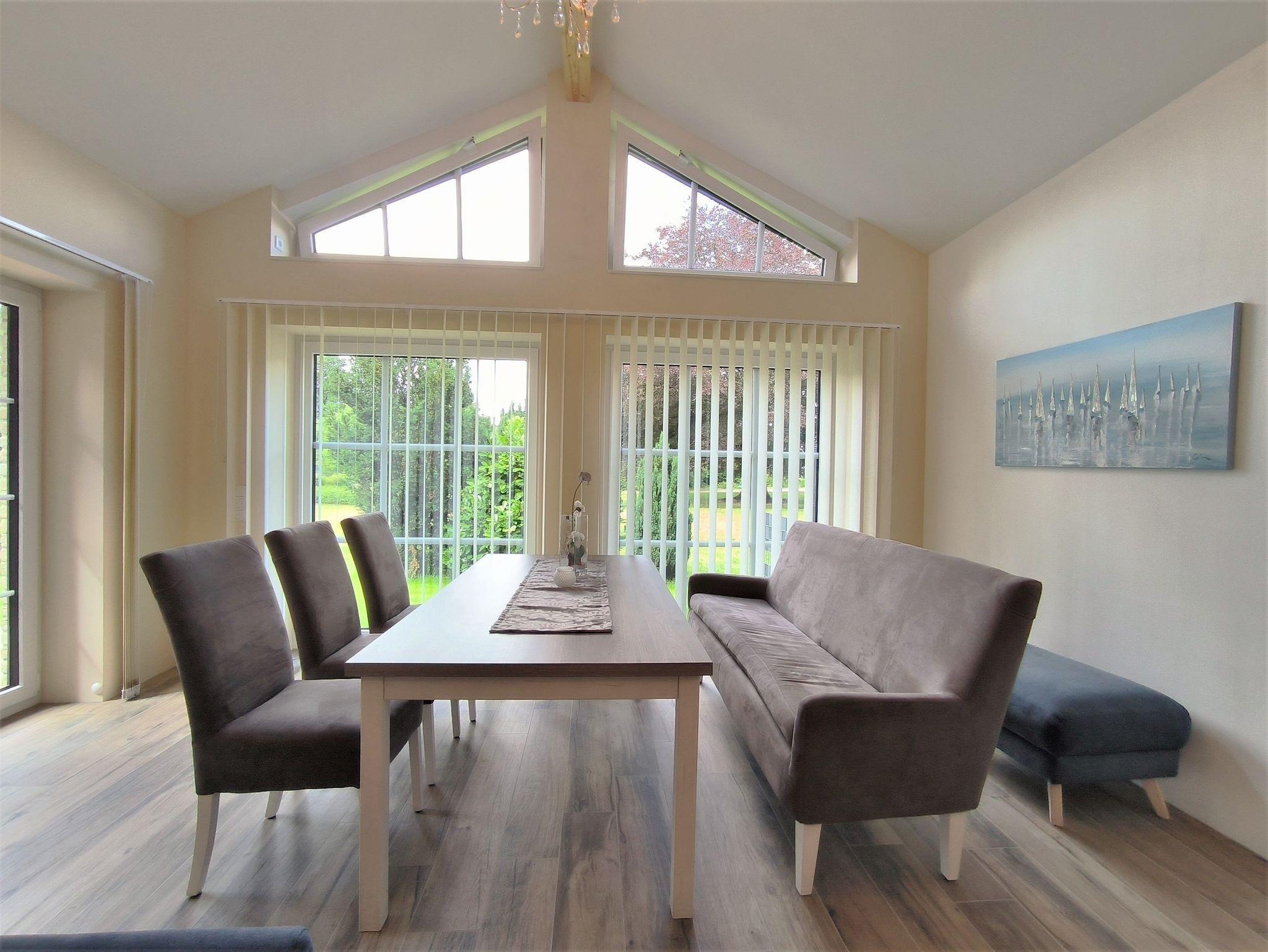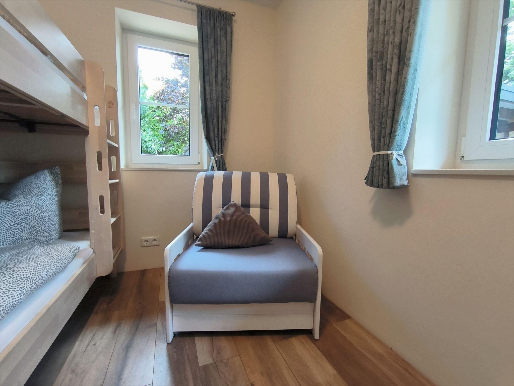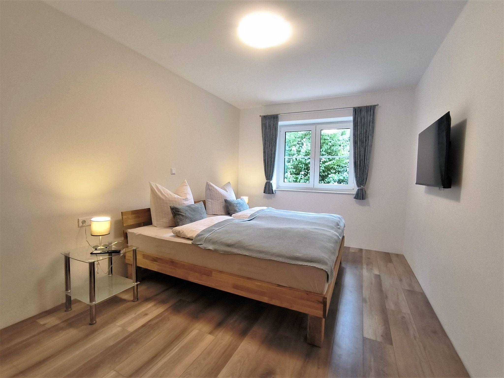 Die Ferienwohnung Buchenblick in einem Bungalowneubau aus dem Jahr 2023 verfügt über ein großes Wohnzimmer mit hohen Decken und einer Fensterfront mit Blick in den Garten. Im Wohnzimmer stehen ein Esstisch, zwei Sofas und ein TV und es gibt einen direkten Zugang zur gut ausgestatteten Küche und einen Ausgang zur Terrasse. Die Terrasse ist mit Gartentisch und -stühlen sowie zwei Sonnenliegen ausgestattet. Im großen Schlafzimmer stehen ein Doppelbett (1,80m x 2,00m) und ein Kleiderschrank, es gibt einen Fernseher und ein Kinderreisebett (auf Anfrage verfügbar) hat auch noch Platz. Im kleineren Schlafzimmer findet sich ein Etagenbett (Matratzengröße: 0,90m x 2,00m), ein Kleiderschrank und ein Sessel, der zu einem weiteren Schlafplatz umgebaut werden kann (0,80m x 2,00m): so können bis zu sechs Personen in der Ferienwohnung übernachten. Beide Schlafzimmer haben Verdunklungsvorhänge und Fliegenfenster. Das große Badezimmer mit Tageslicht hat eine ebenerdige Dusche, Waschbecken und Toilette sowie eine Waschmaschine. Es stehen ein abschließbarer Raum für Fahrräder o.ä. und ein Carport direkt am Haus zur Verfügung. In demselben Gebäude findet sich noch eine zweite, kleinere Wohnung für bis zu vier Personen (Grünberg).