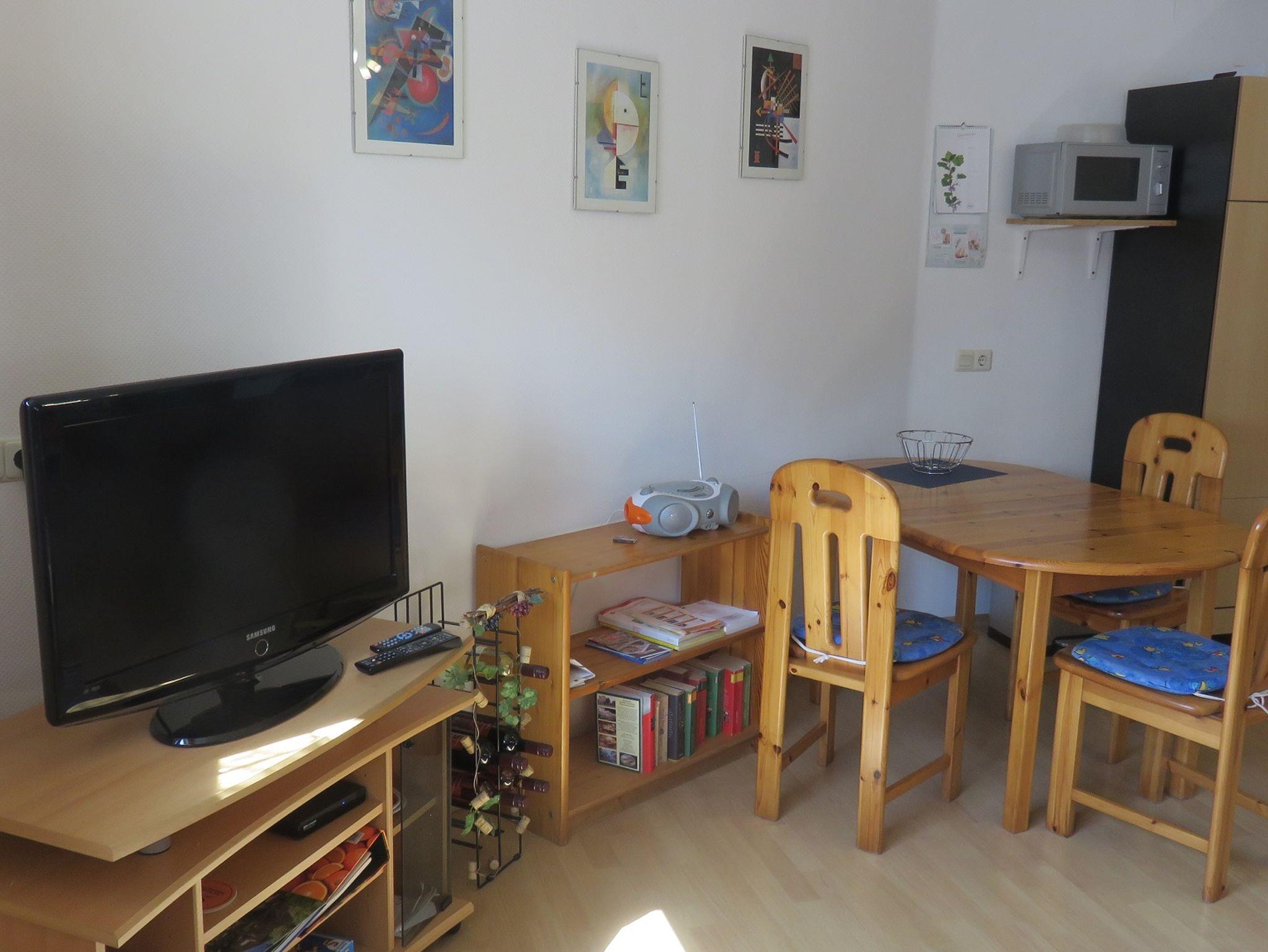 Auf dem sonnigen Freisitz befinden sich komfortable Gartenmöbel. Die Souterrainwohnung verfügt über einen kombinierten Wohn- und Schlafbereich mit Doppelbett und Schlafsofa für die dritte Person. Der Wohnbereich verfügt zudem über einen SAT-TV und Radio. Die Küche ist komplett ausgestattet (Herd, Backofen, Geschirrspüler, Geschirr, Besteck, Wasserkocher, Toaster, Kaffeemaschine, Küchenwäsche und viele weitere Küchenutensilien). Das Badezimmer ist mit Haartrockner, Dusche und WC ausgestattet.