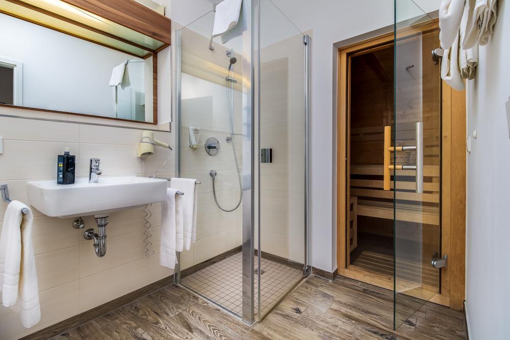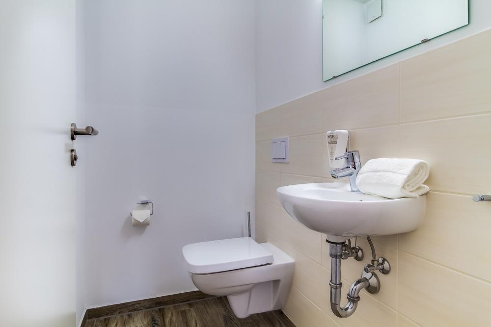 - Badezimmer mit WC und ebenerdiger Dusche sowie Fön