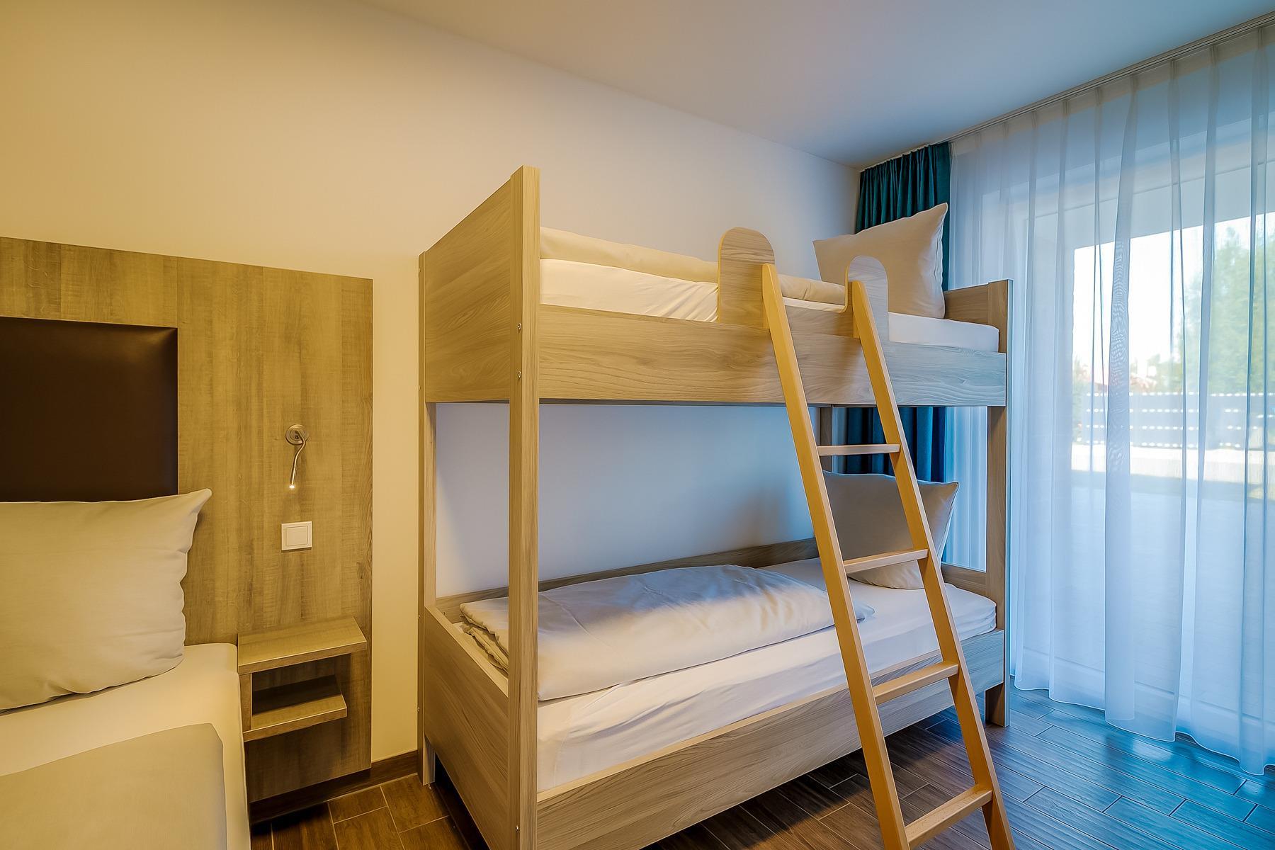 Familien-Appartement "Piratennest" im Maisonette-Stil hat eine Wohnfläche von 113 m². Im Erdgeschoß befindet sich ein Schlafzimmer, ein Badezimmer mit WC und Dusche sowie Infrarotkabine. Das Obergeschoß besteht aus einem großen kombinierten Wohn- und Essbereich mit Einbauküche, Sitzecke und einer Wohnlandschaft (mit Schlafcouch), ein Schlafzimmer sowie einem Badezimmer mit WC und Dusche. Auf dem Dach befindet sich eine große teilüberdachte Terrasse mit Sitzmöbeln.