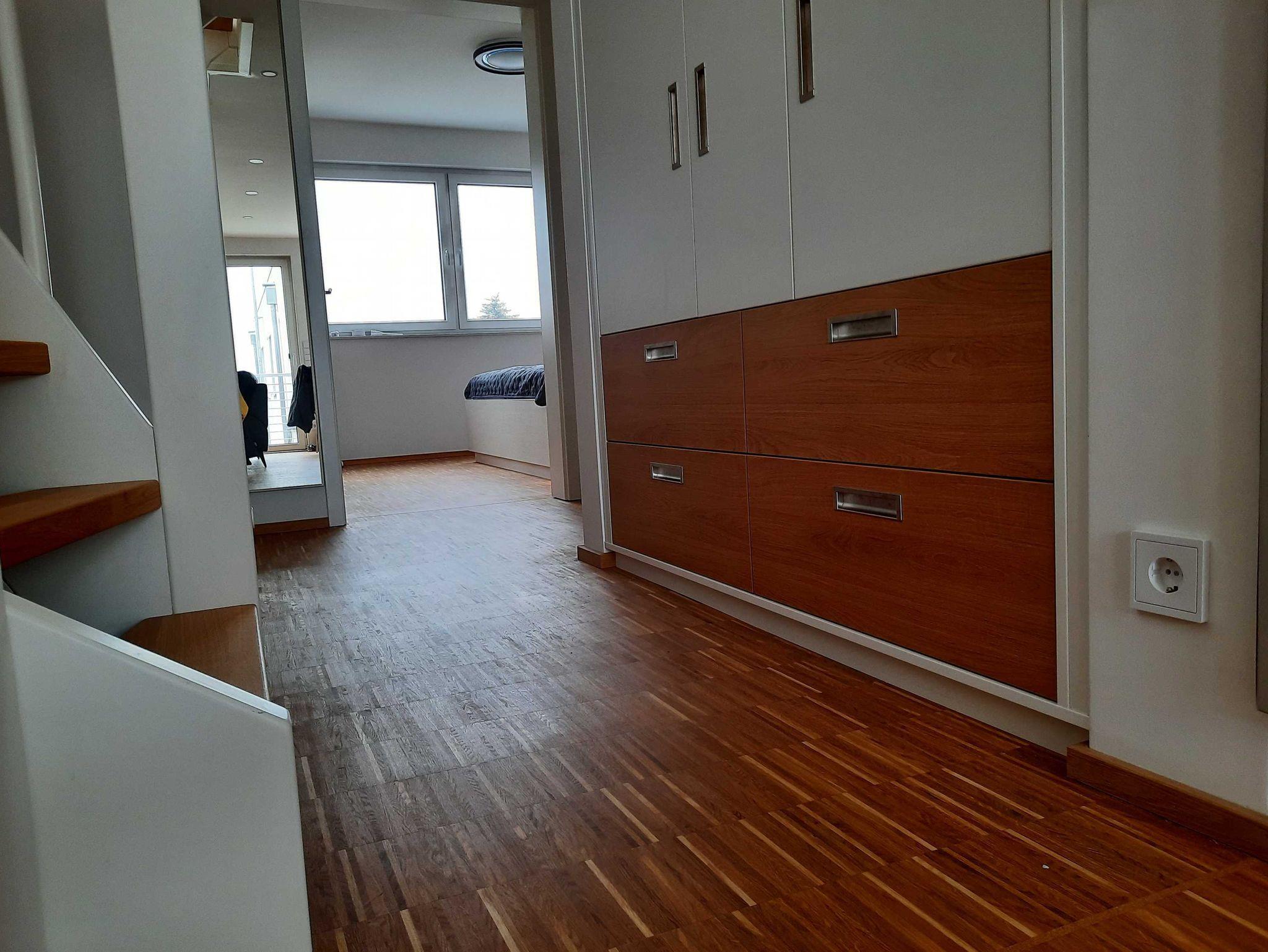 Die Wohnung hat eine Fläche von ca. 65 qm mit Wohn-/Essbereich und einem Balkon, ein Schlafzimmer, Bad mit Dusche und Wanne. Eine Treppe führt vom Flur aus über einen weiteren Raum auf die Dachterrassen (Dachterrasse-Süd ca. 35 m²/Dachterrasse-Ost ca. 16 m²). In dem oberen Raum - ca 5 m² - befindet sich eine kleine Galerie mit einer Schlafgelegenheit (Sofa mit Bettfunktion- Liegefläche 2 m x 1,30 m). Die Räume haben Parkett und Fußbodenheizung. Die Wohnung verfügt über eine moderne, voll ausgestattete Küche mit Induktionskochfeld, Geschirrspüler, Backofen, Mikrowelle, Kaffeemaschine, Geschirr etc.), Essecke (4 Plätze), einen eingerichteten Wohnbereich mit Sat-TV-Radio-CD-Player, Schlafzimmer mit einem Doppelbett, Wandschrank mit TV. Für die Dachterrassen sind Loungemöbel und Liegen vorhanden.