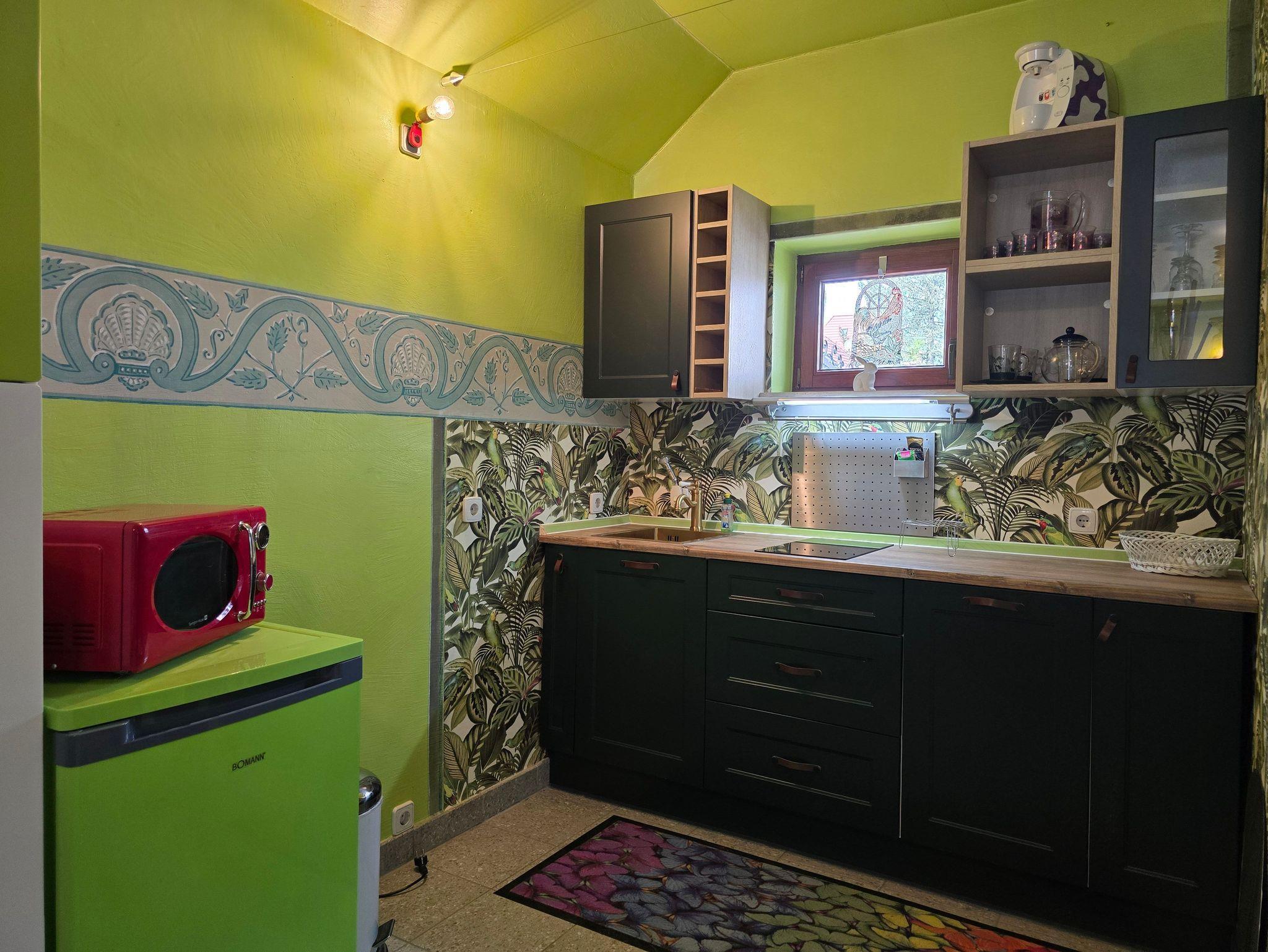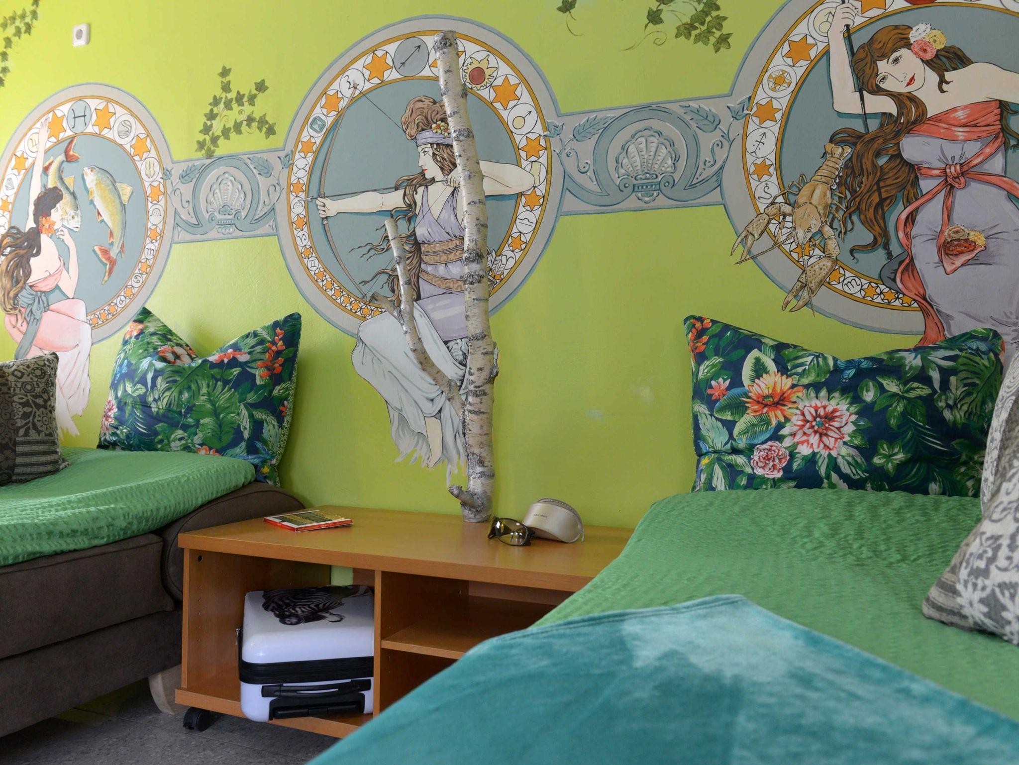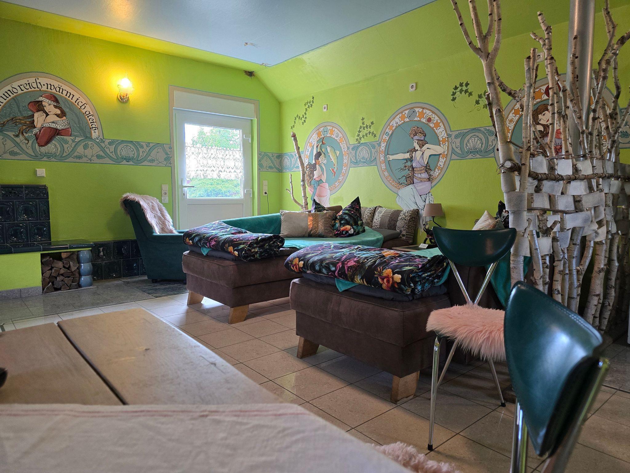Neu renoviert seit 2025 ist unsere Ferienwohnung Bett & Bike Natur mit 30m² für zwei Personen. Nicht nur der alte Kaminofen und die schönen Wandmalereien im Stil Mucha bieten ein besonderes Übernachtungsquartier. Hier spielt Romantik eine Rolle.