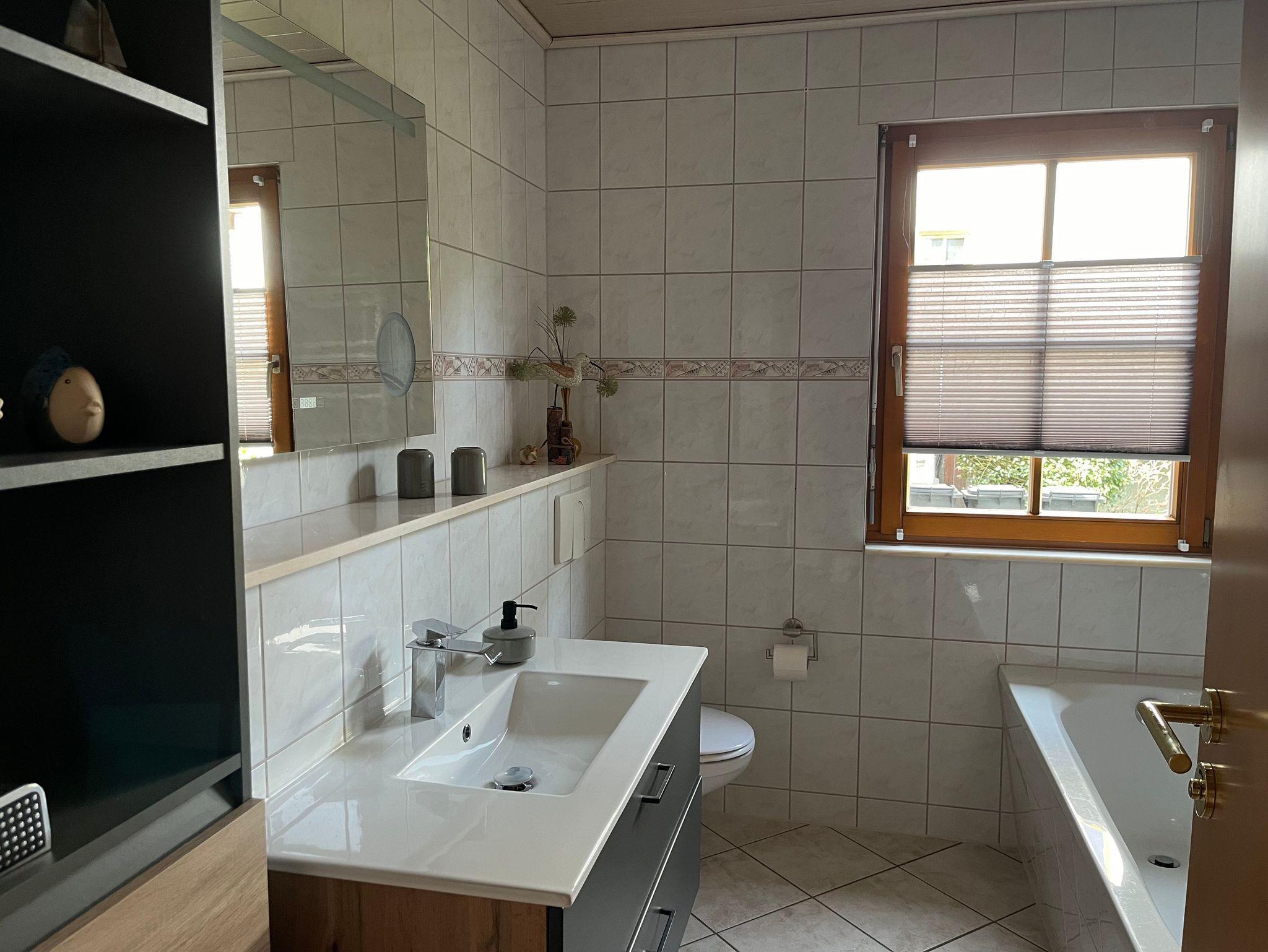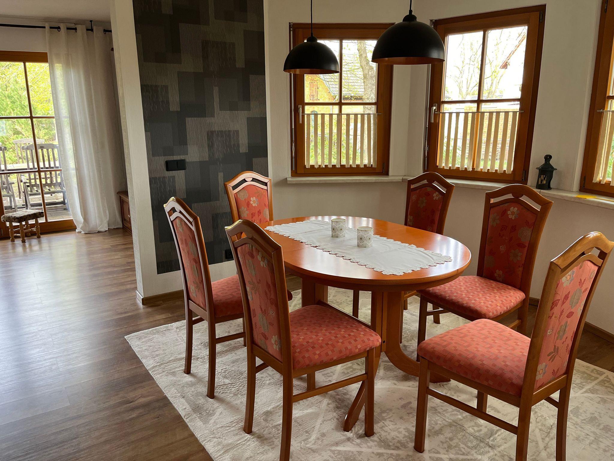 Die Ferienwohnung ist 75m² und bietet Platz für 4 Personen. Sie verfügt über ein Wohnzimmer mit TV, einem Essbereich, 2 Schlafzimmern, Küche und einem Bad mit DU, Badewanne und WC. Vom Wohnzimmer gelangt man auf die Terrasse und in den Garten. Eine Grillmöglichkeit ist im Garten vorhanden. Für die Ferienwohnung steht ein Parkplatz auf dem Grundstück zur Verfügung.