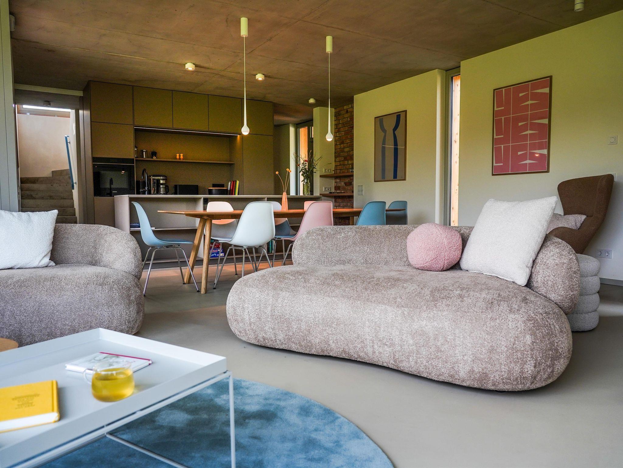 Versammeln Sie sich um den großen Esstisch für ein besonderes Abendessen und lassen Sie sich von dem hellen, schlichten Design und den gedeckten Farben berühren.