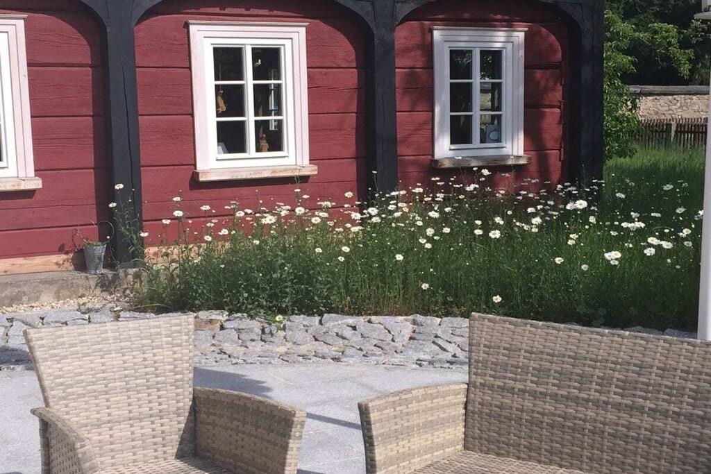 Stueetage: (spisestue(Fjernsyn, spisebord, varme), Køkken(kogeplade, ovn, køleskab, fryser), soveværelse(dobbeltseng, Fjernsyn, radio), Børneværelse(enkeltseng, barneseng), badeværelse(bruser, håndvask, toilet, Håndklæder inkl.)) , , Internetadgang, Førstehjælp, varme, terrasse(, havemøbler), have(Grill center, Græsplæne, havemøbler), strygebræt, strygejern, tørreskab,