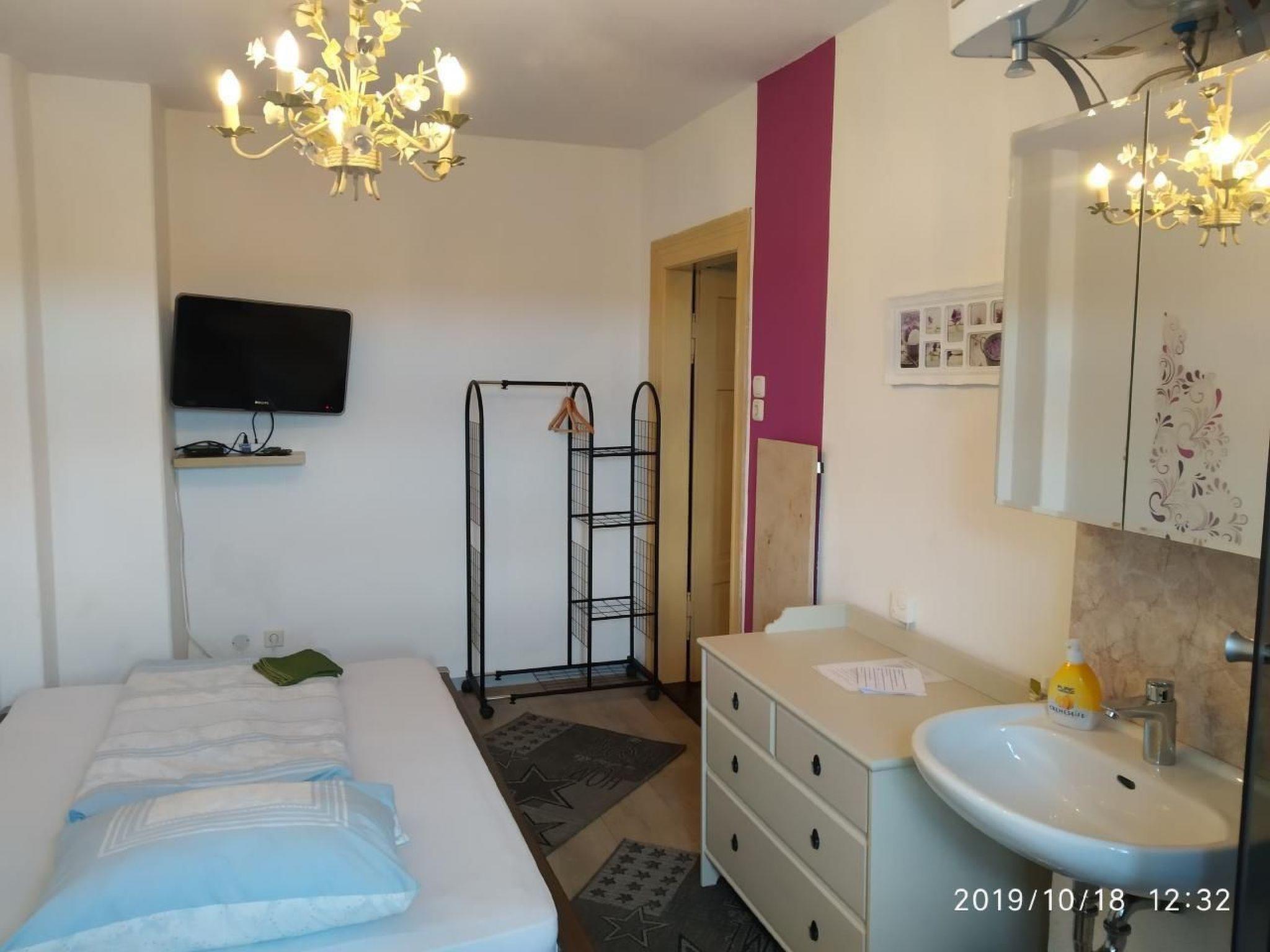 Guest room 1 with a double bed has a shower as well as a table, wardrobe and TV.