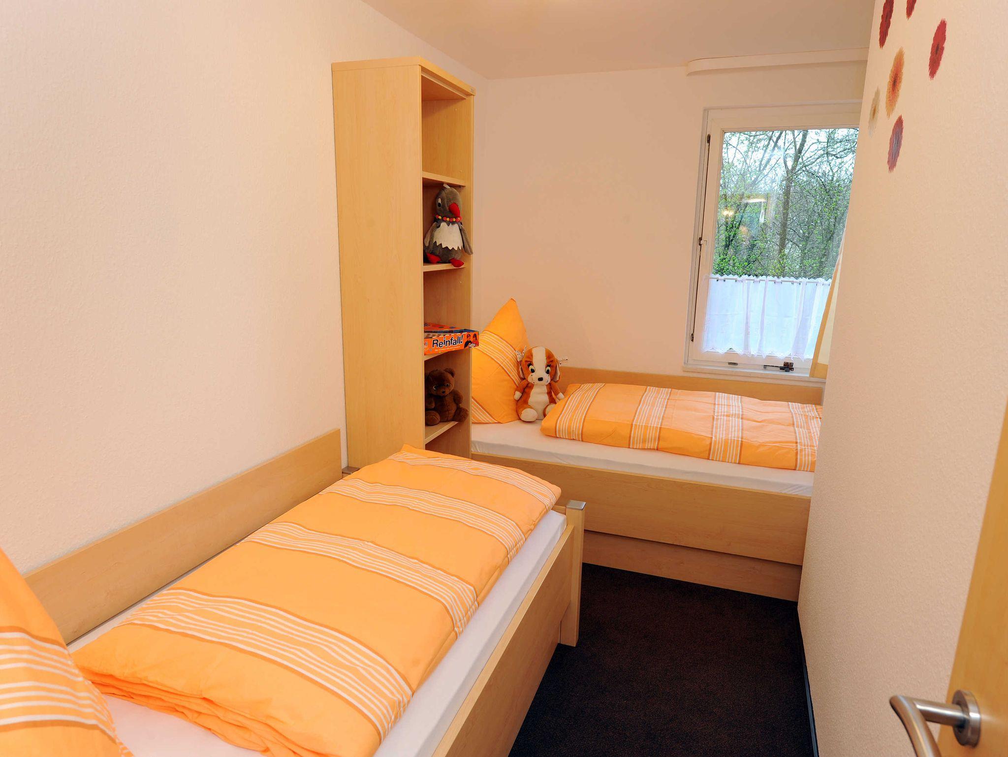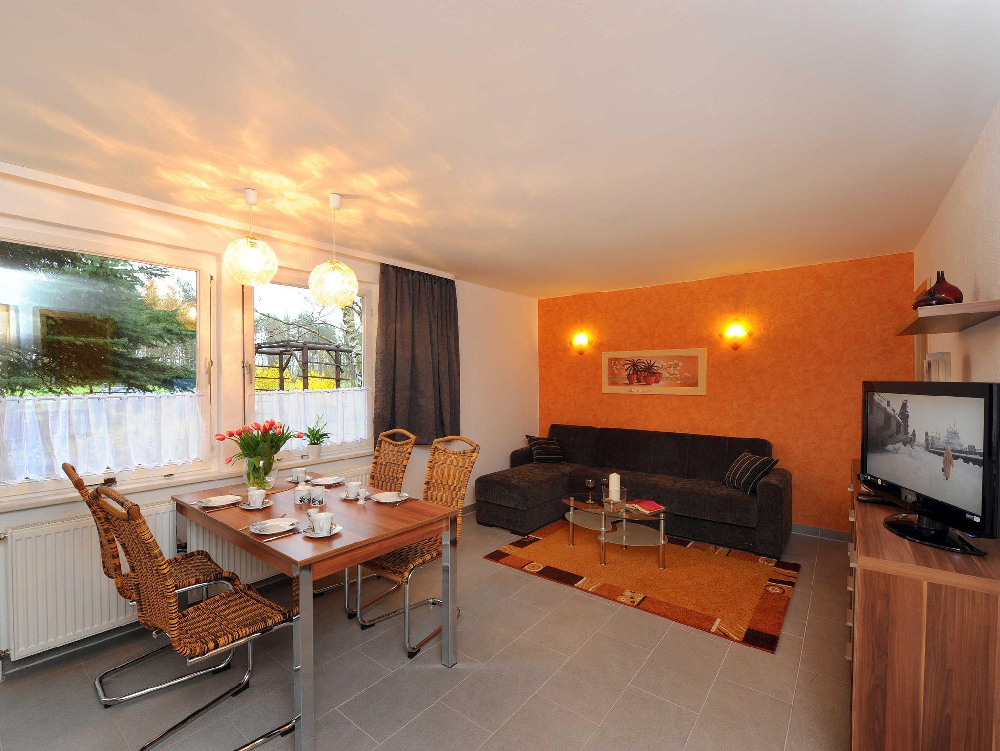 Ferienwohnung im Reihenhauscharakter fast ebenerdig (2 Stufen) mit eigener möblierter Terrasse, 1 SZ mit Teppich, Schrank, Doppelbett (180x200) und 2 Nachttischen, 1 SZ mit Teppich, Regal und 2 Einzelbetten (90x200), WZ gefliest mit Couch-Ecke, Familienesstisch, Anrichte mit Flachbildfernseher, Garderobe und integrierter gut ausgestatteter Küche.