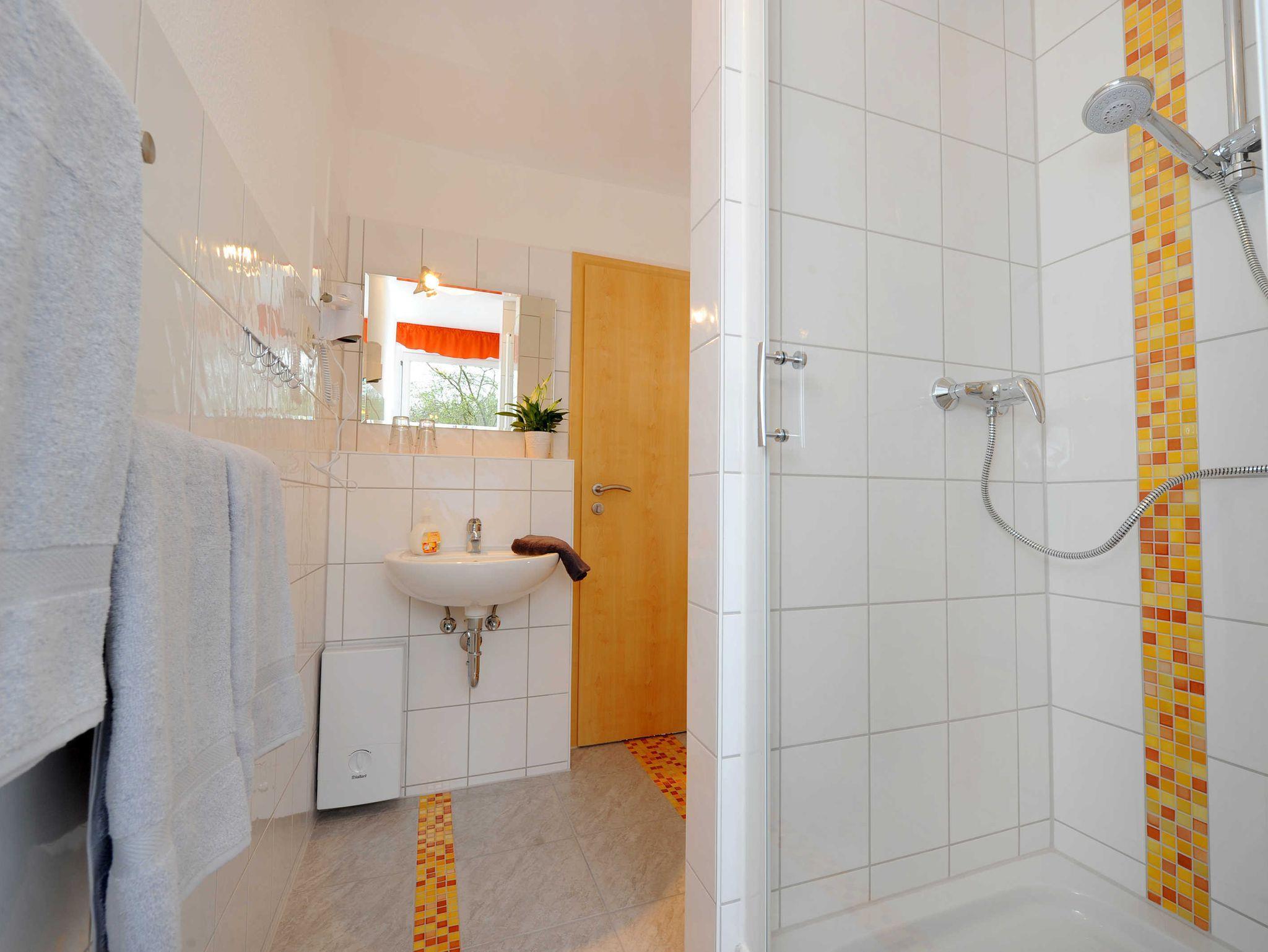 Bad mit Fenster, Waschbecken, Spiegel, Echtglasdusche, WC und Fön.