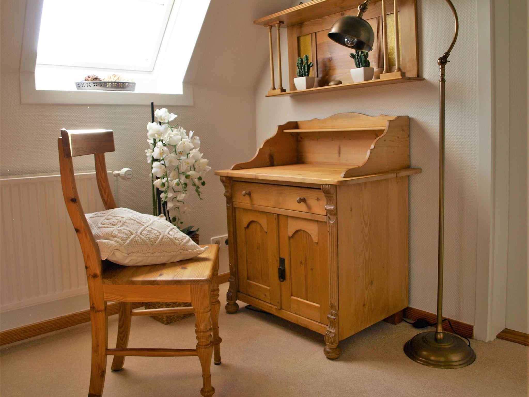 Das im OG befindliche Schlafzimmer verfügt ebenfalls über Holzdielen und bietet viel Platz durch geräumige Einbauschränke. Eine weitere Schlafmöglichkeit für zwei Personen (2 x 2 m) befindet sich im „Alkoven“ im Dachgeschoss (keine Stehhöhe).