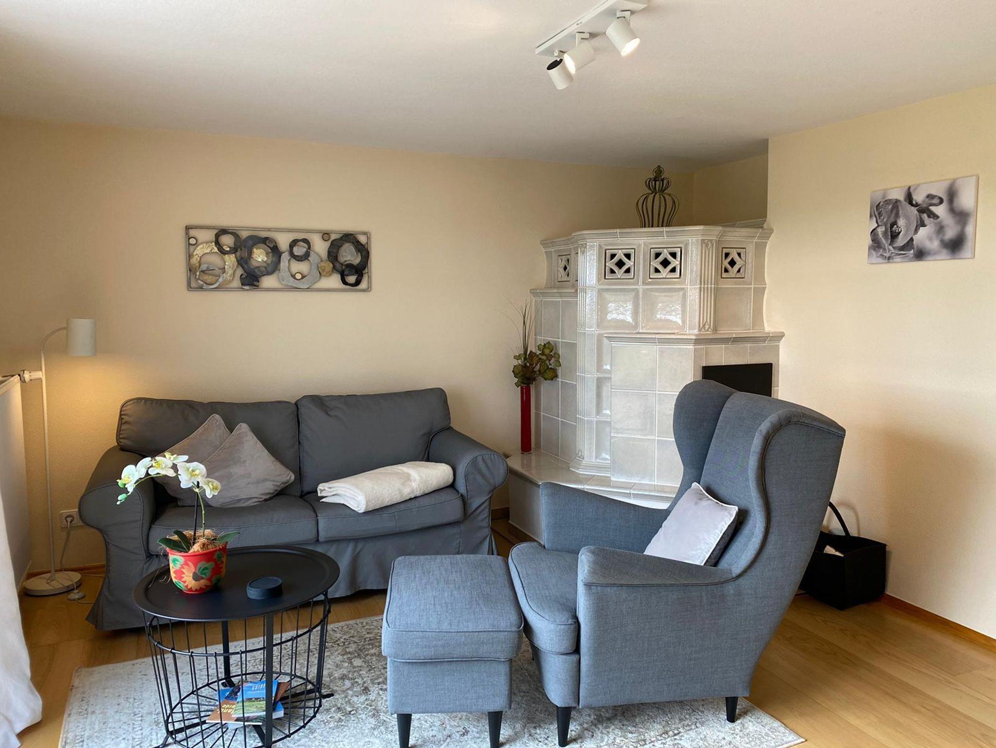 Die helle und moderne Einbauküche steht in klarem Gegensatz zu dem gemütlichen, nordischen Wohnzimmer mit Holzdielenboden und friesischem Kachelofen, der an kalten Tagen heimelige Wärme spendet.